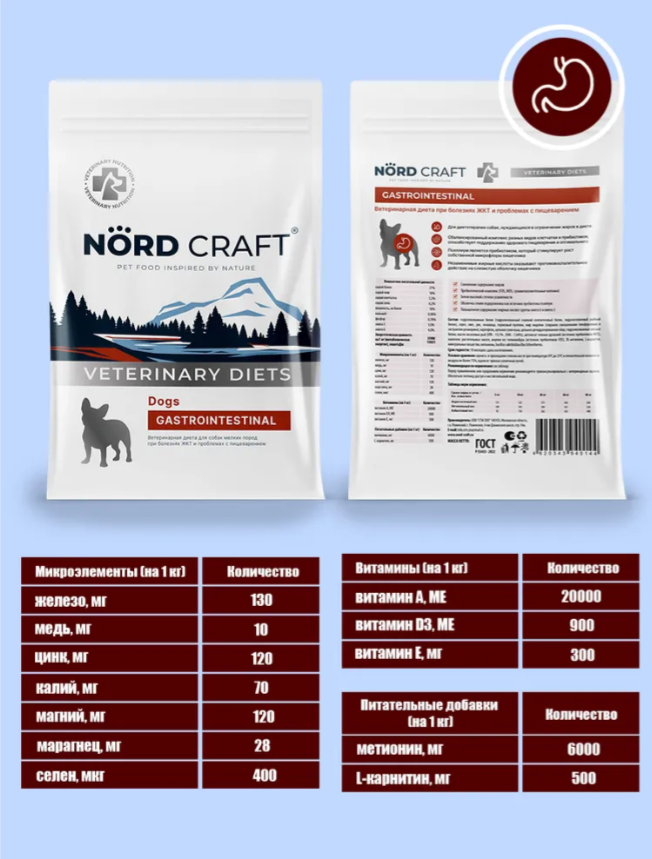Сухой корм gastrointestinal для собак мелких пород Nord Craft — ветеринарная диета при заболеваниях желудочно-кишечного тракта (ЖКТ).