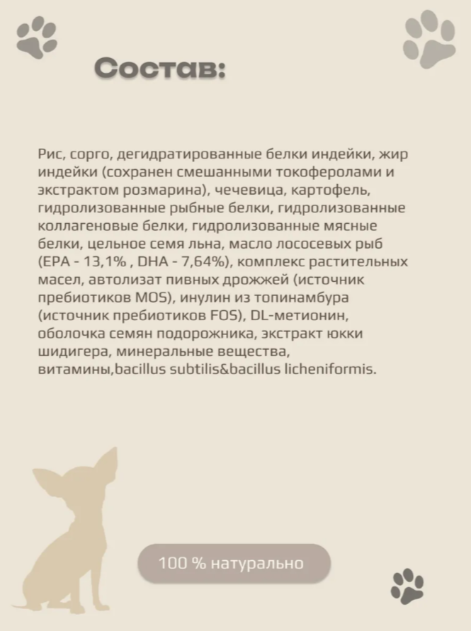 В составе также присутствуют чечевица, картофель, семена льна и масло лососевых рыб, богатые Омега-3 и Омега-6 жирными кислотами для здоровья кожи и шерсти.