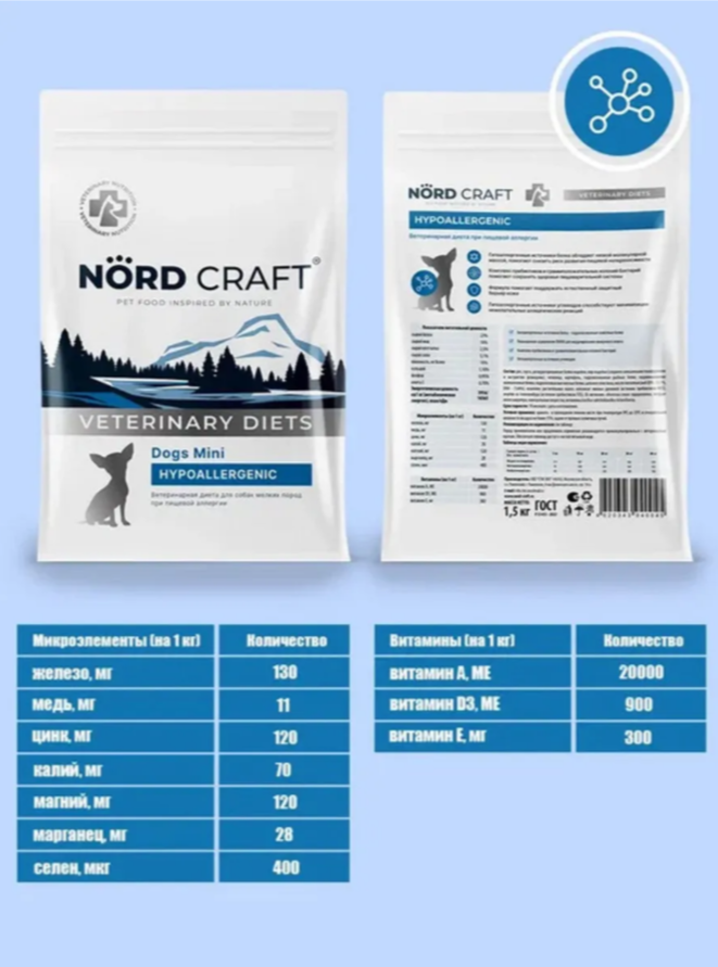 Сухой корм для собак мелких пород Hypoallergenic Nord Craft — это специализированный сухой корм супер-премиум класса для мелких пород HYPOALLERGENIC , созданный для собак, страдающих от пищевой аллергии и повышенной чувствительности.