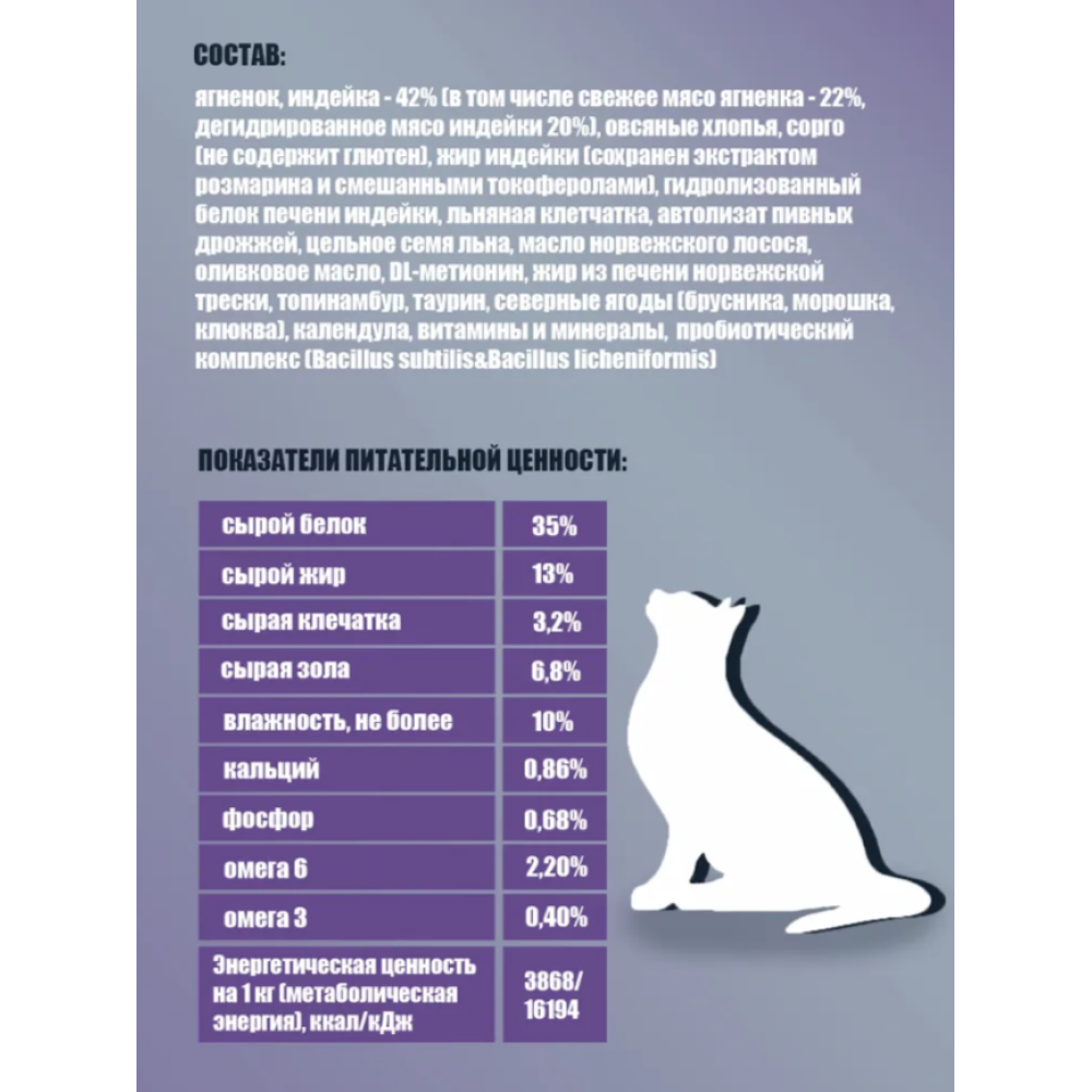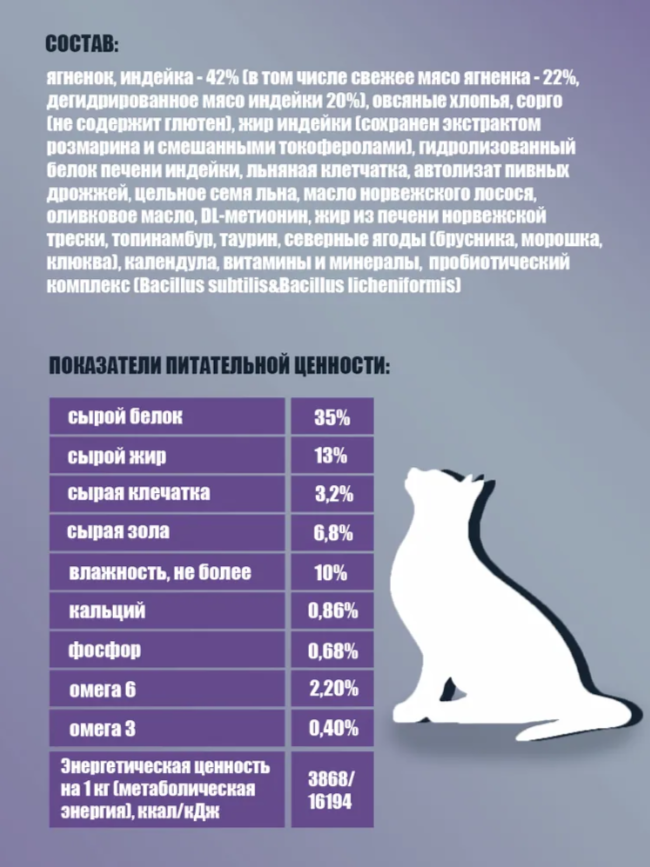 Основной ингредиент – гипоаллергенное мясо высшего качества (ягненок, индейка)