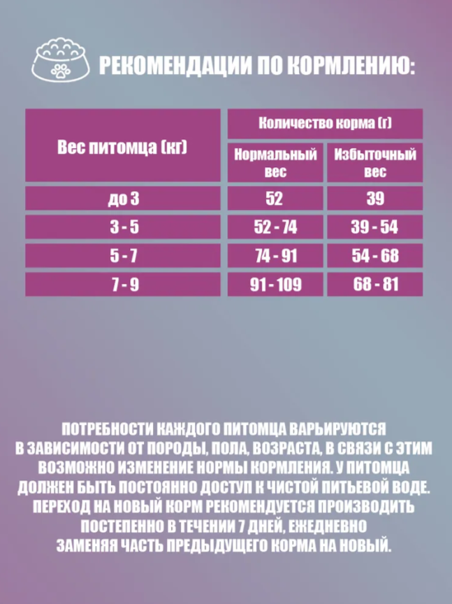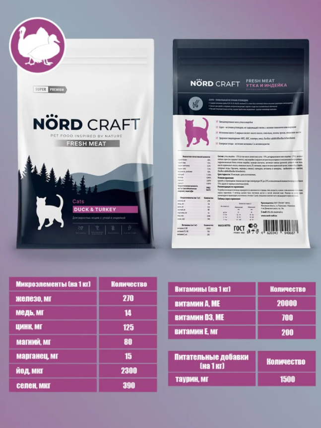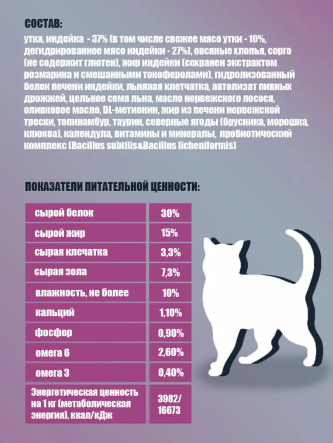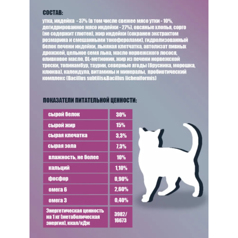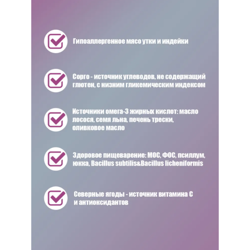 Основной ингредиент – гипоаллергенное мясо высшего качества (утка, индейка)