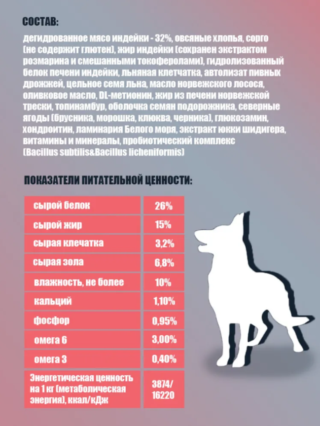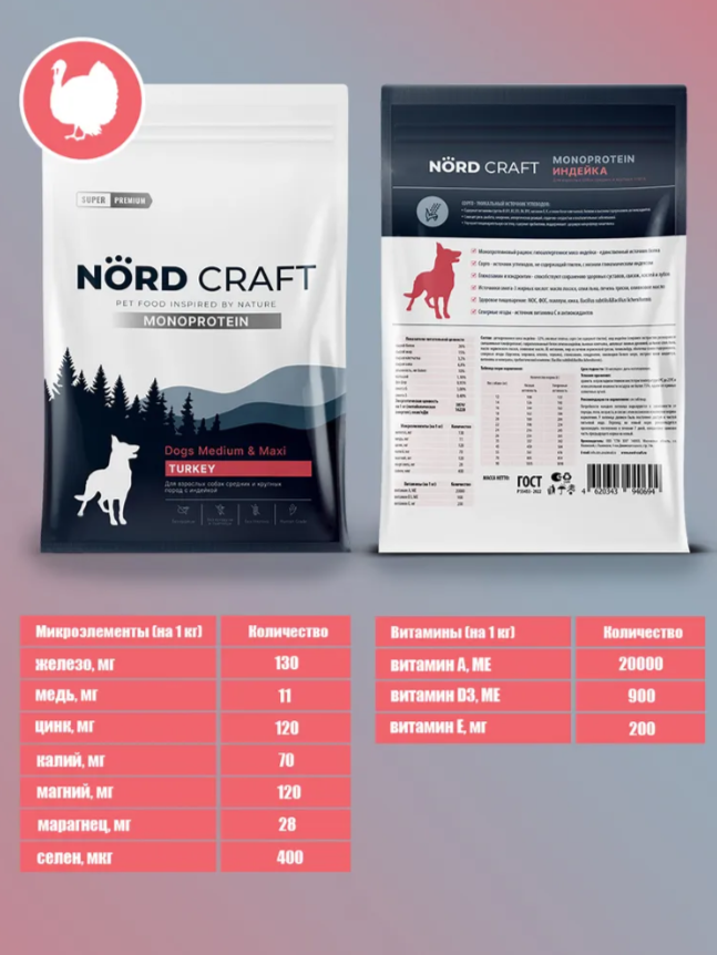 Сухой корм для взрослых собак средних и крупных пород с индейкой Монопротеиновый рацион: гипоаллергенное мясо индейки - единственный источник белка