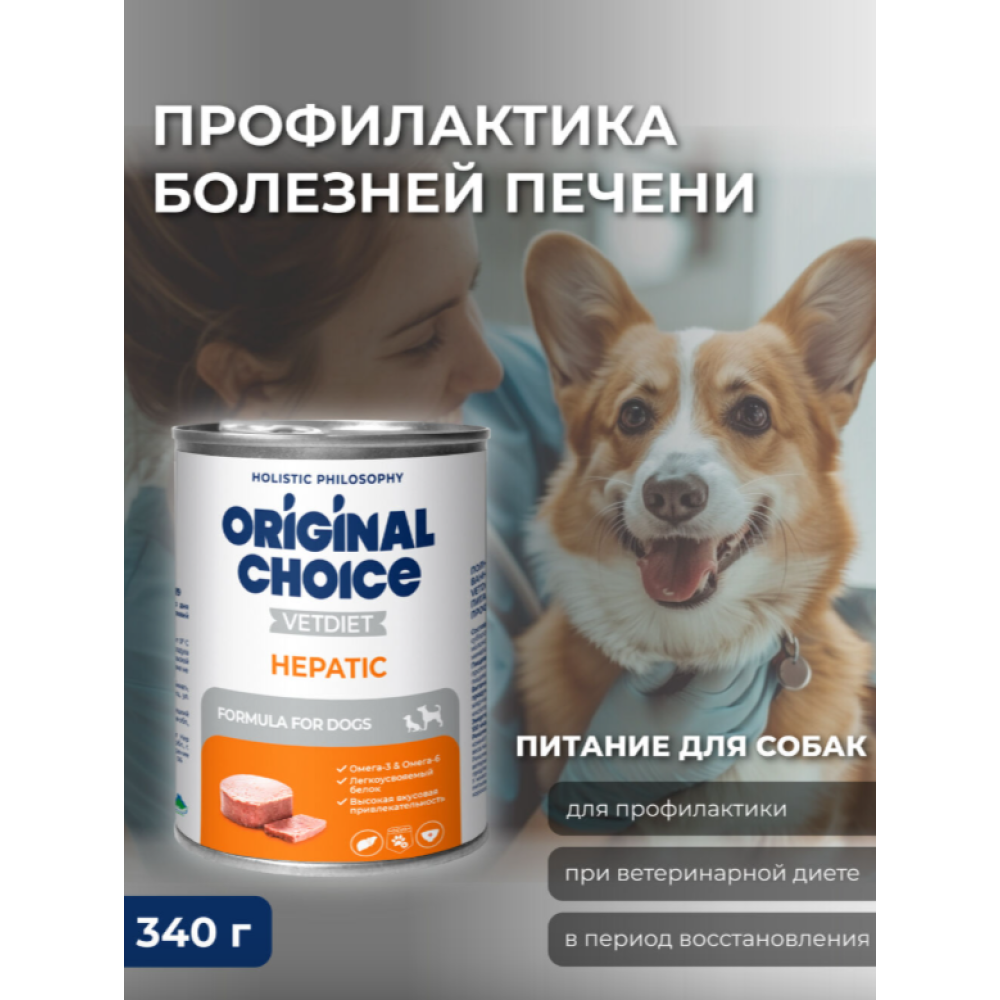 Полнорационный консервированный корм с высоким содержанием легкоусвояемых белков ORIGINAL CHOICE VETDIET Hepatic предназначен в качестве диетического питания для профилактики в период терапии болезней печени для собак.