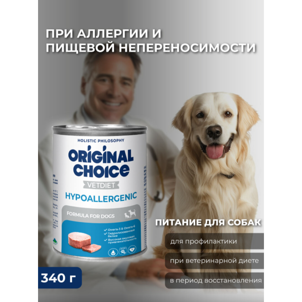 Полнорационный консервированный гипоаллергенный корм ORIGINAL CHOICE VETDIET Hypoallergenic предназначен для собак с пищевой аллергией или непереносимостью.