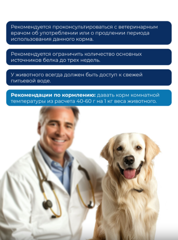 РЕКОМЕНДУЕТСЯ ПРОКОНСУЛЬТИРОВАТЬСЯ С ВЕТЕРИНАРНЫМ ВРАЧОМ ОБ УПОТРЕБЛЕНИИ ИЛИ О ПРОДЛЕНИИ ПЕРИОДА ИСПОЛЬЗОВАНИЯ ДАННОГО КОРМА.