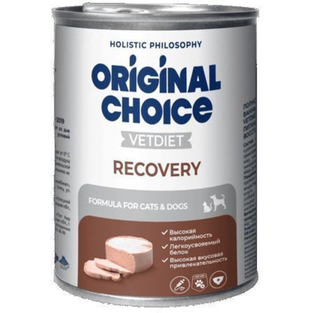 Полнорационный консервированный легкоусвояемый корм ORIGINAL CHOICE VETDIET Recovery предназначен в качестве диетического питания для собак и кошек в период анорексии, выздоровления, послеоперационного восстановления.