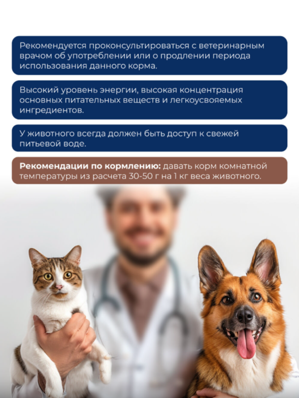 Высокий уровень энергии, высокая концентрация основных питательных веществ и легкоусвояемых ингредиентов.