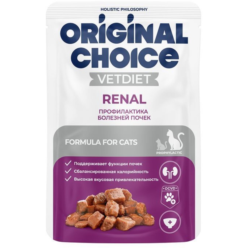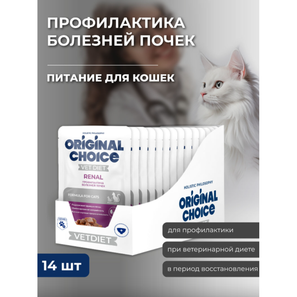 Полнорационный консервированный корм с пониженным содержанием белка и фосфора ORIGINAL CHOICE VETDIET Renal предназначен для кошек с нарушениями функции почек: для профилактики образования оксалатов, при хронической почечной недостаточности, для снижения уровня азотемии в крови.