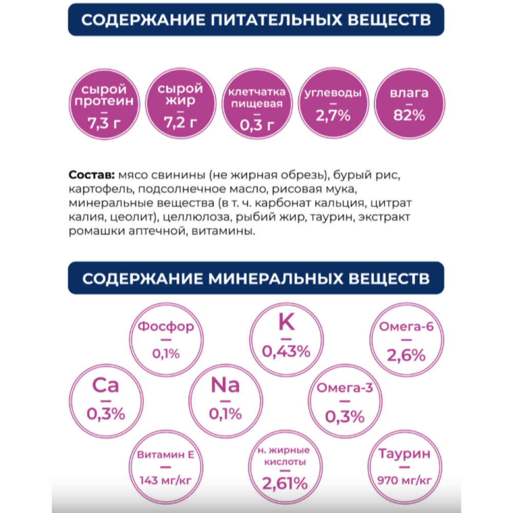 На 100 гр продукта: сырой протеин - 7,3 г, сырой жир - 7,2 г, клетчатка 0,3 г, углеводы - 2,7%, таурин - 970мг/кг, влага - 82 %.