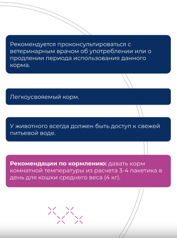 РЕКОМЕНДУЕТСЯ ПРОКОНСУЛЬТИРОВАТЬСЯ С ВЕТЕРИНАРНЫМ ВРАЧОМ ОБ УПОТРЕБЛЕНИИ ИЛИ О ПРОДЛЕНИИ ПЕРИОДА ИСПОЛЬЗОВАНИЯ ДАННОГО КОРМА.