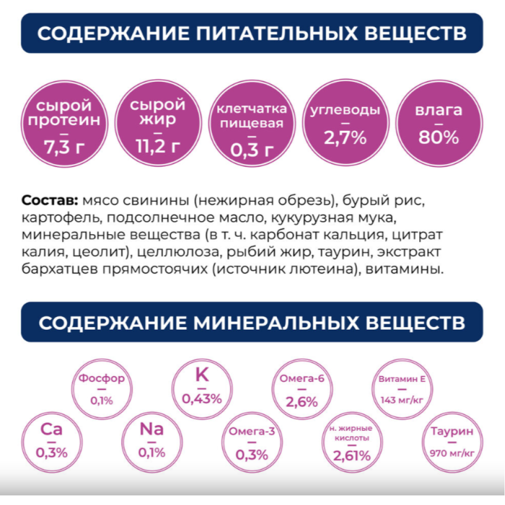 На 100 гр продукта: сырой протеин - 7,3 г, сырой жир - 11,2 г, клетчатка - 0,3 г, углеводы - 2,7%, таурин - 970мг/кг, влага - 80%.