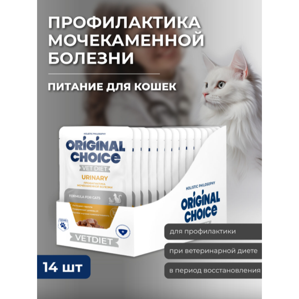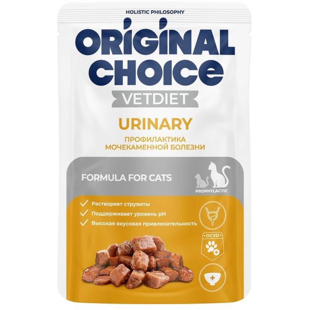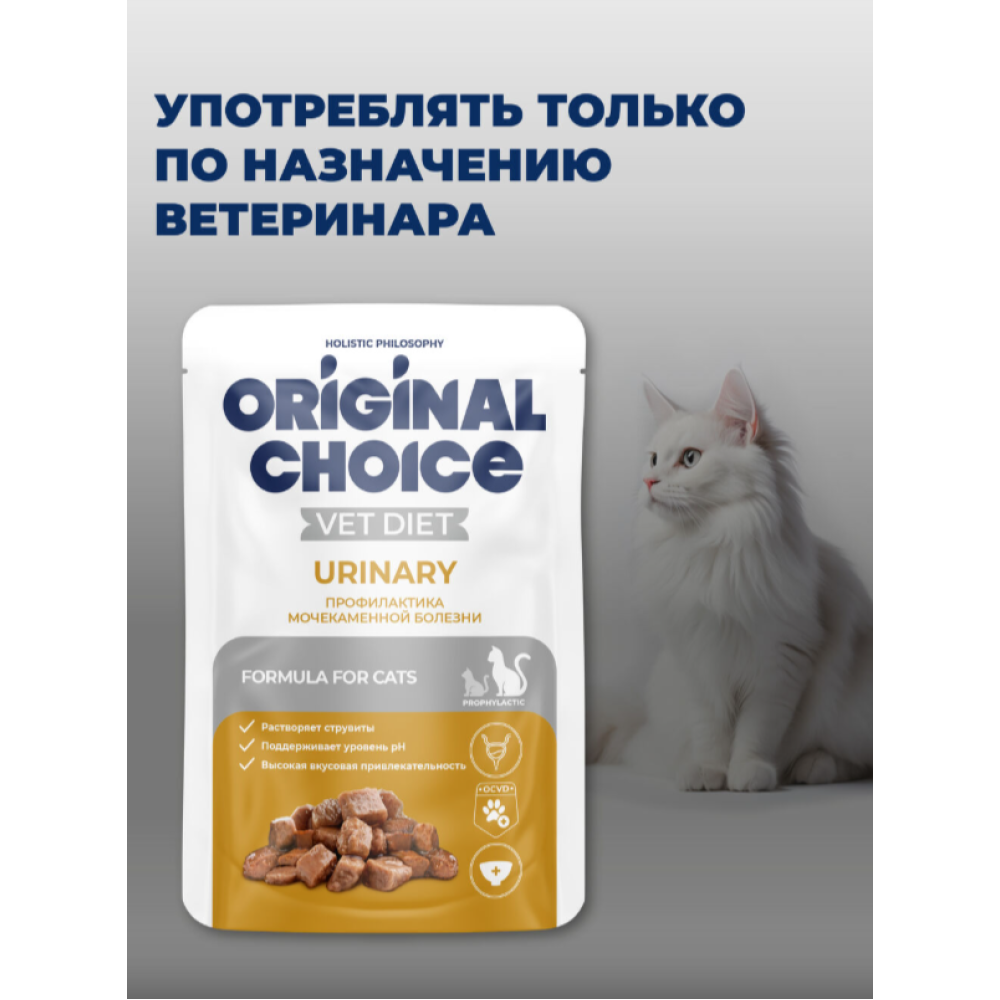 Полнорационный консервированный корм со свойствами подкисления мочи и низким содержанием магния, фосфора и кальция, уменьшенной калорийности ORIGINAL CHOICE VETDIET Urinary предназначен для кошек, страдающих мочекаменной болезнью: для лечения и профилактики, растворения струвитных камней и снижения вероятности их повторного образования.