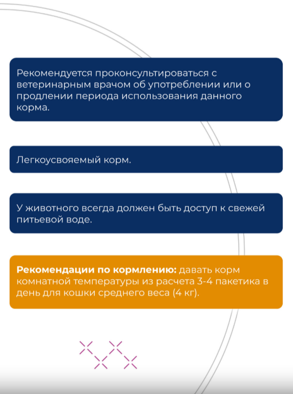 РЕКОМЕНДУЕТСЯ ПРОКОНСУЛЬТИРОВАТЬСЯ С ВЕТЕРИНАРНЫМ ВРАЧОМ ОБ УПОТРЕБЛЕНИИ ИЛИ О ПРОДЛЕНИИ ПЕРИОДА ИСПОЛЬЗОВАНИЯ ДАННОГО КОРМА.