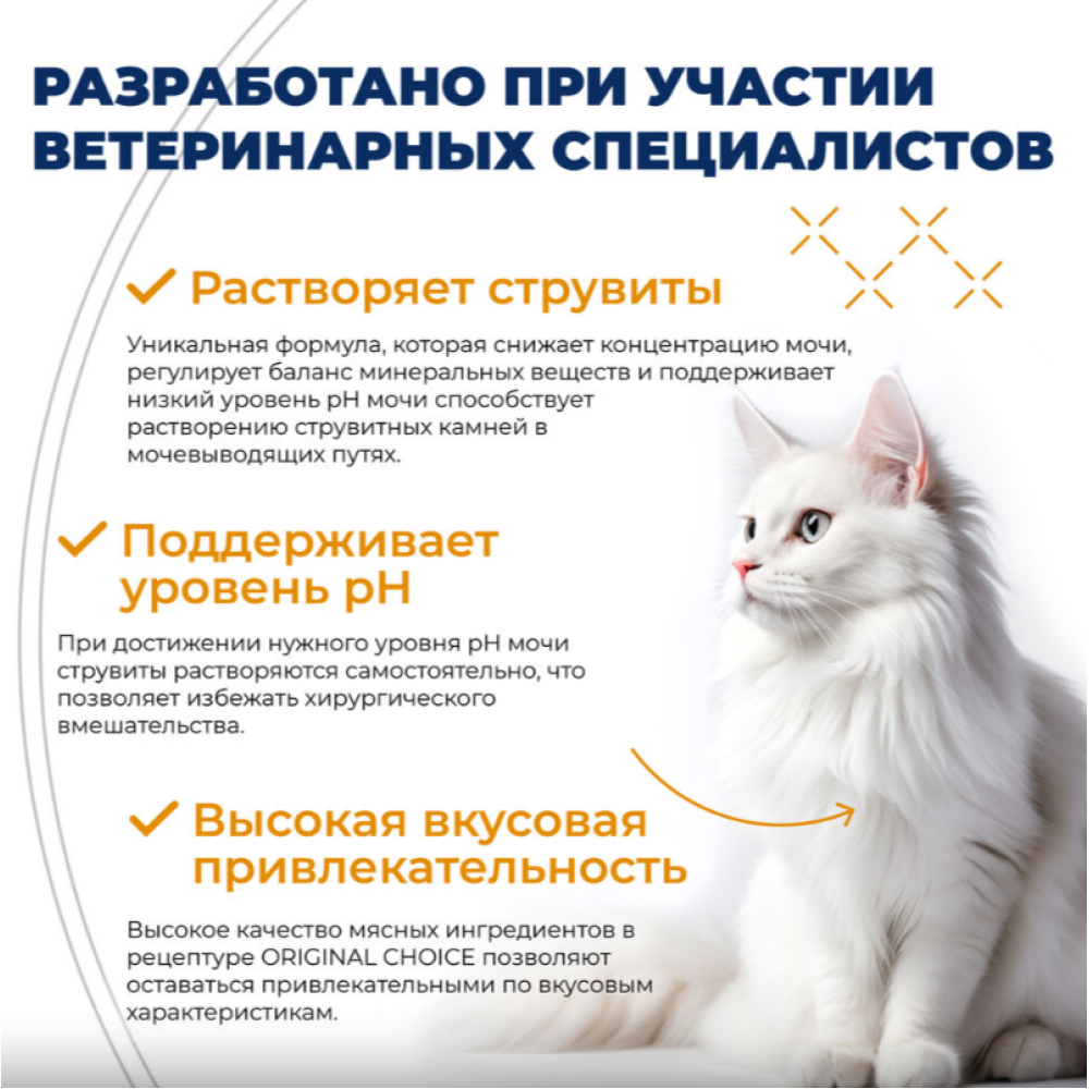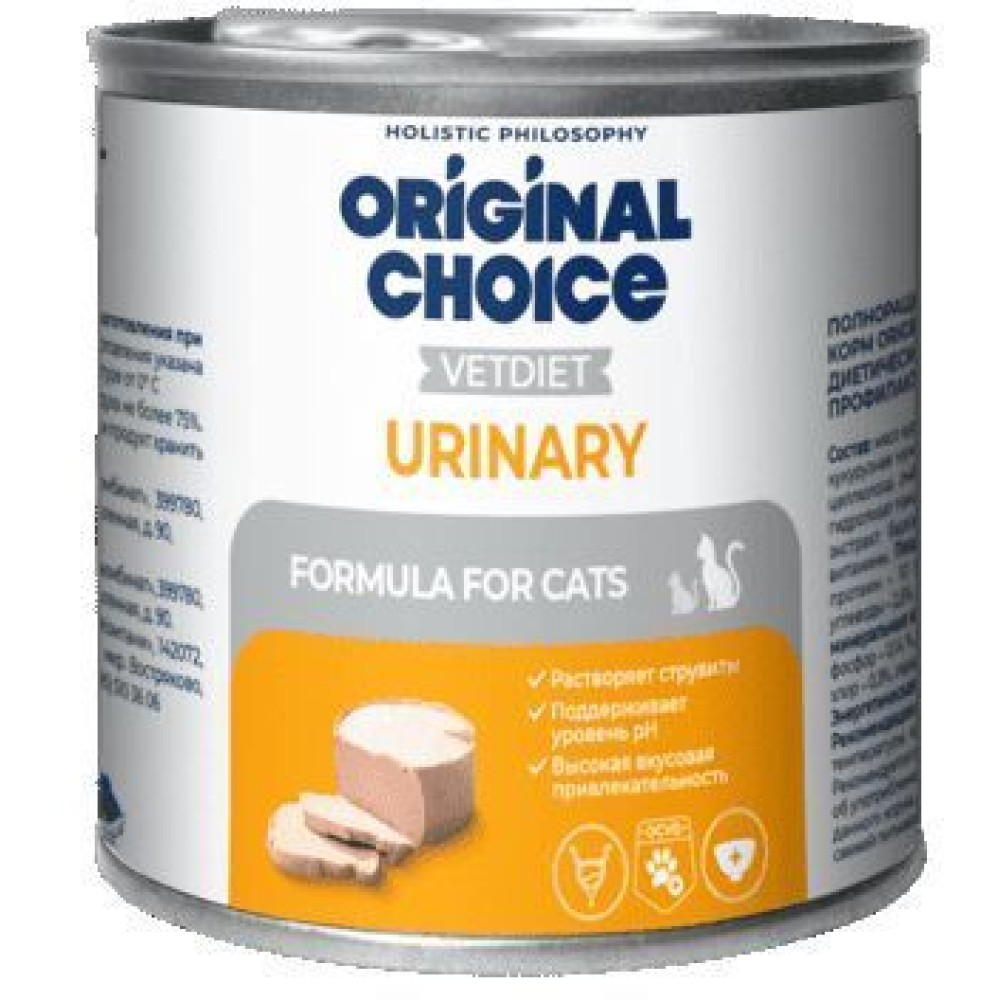 Полнорационный консервированный корм со свойствами подкисления мочи и низким содержанием магния, фосфора и кальция, уменьшенной калорийности ORIGINAL CHOICE VETDIET Urinary предназначен для кошек, страдающих мочекаменной болезнью: для лечения и профилактики, растворения струвитных камней и снижения вероятности их повторного образования.