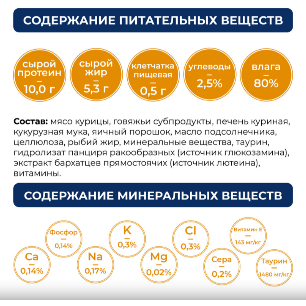На 100 гр продукта: сырой протеин -10,0 г, сырой жир - 5,3 г, клетчатка - 0,5 г, углеводы - 2,5%, таурин -1480 мг/кг, влага - 80%.
