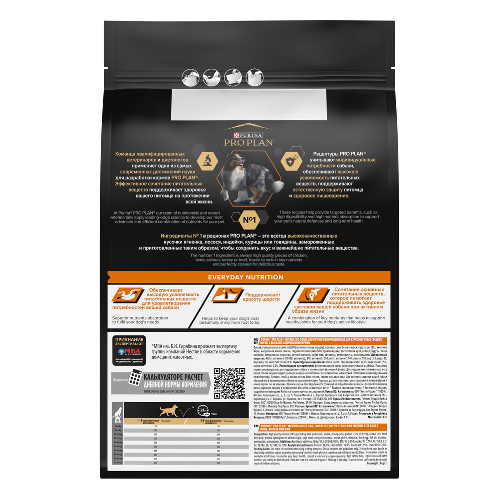 Изучая потребности собак на протяжении многих лет, команда квалифицированных ветеринарных специалистов и диетологов PURINA разработала сухой корм PRO PLAN® Everyday Nutrition — ежедневный рацион с высоким содержанием курицы для взрослых собак средних пород.