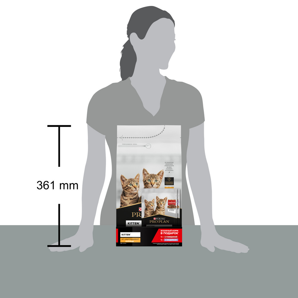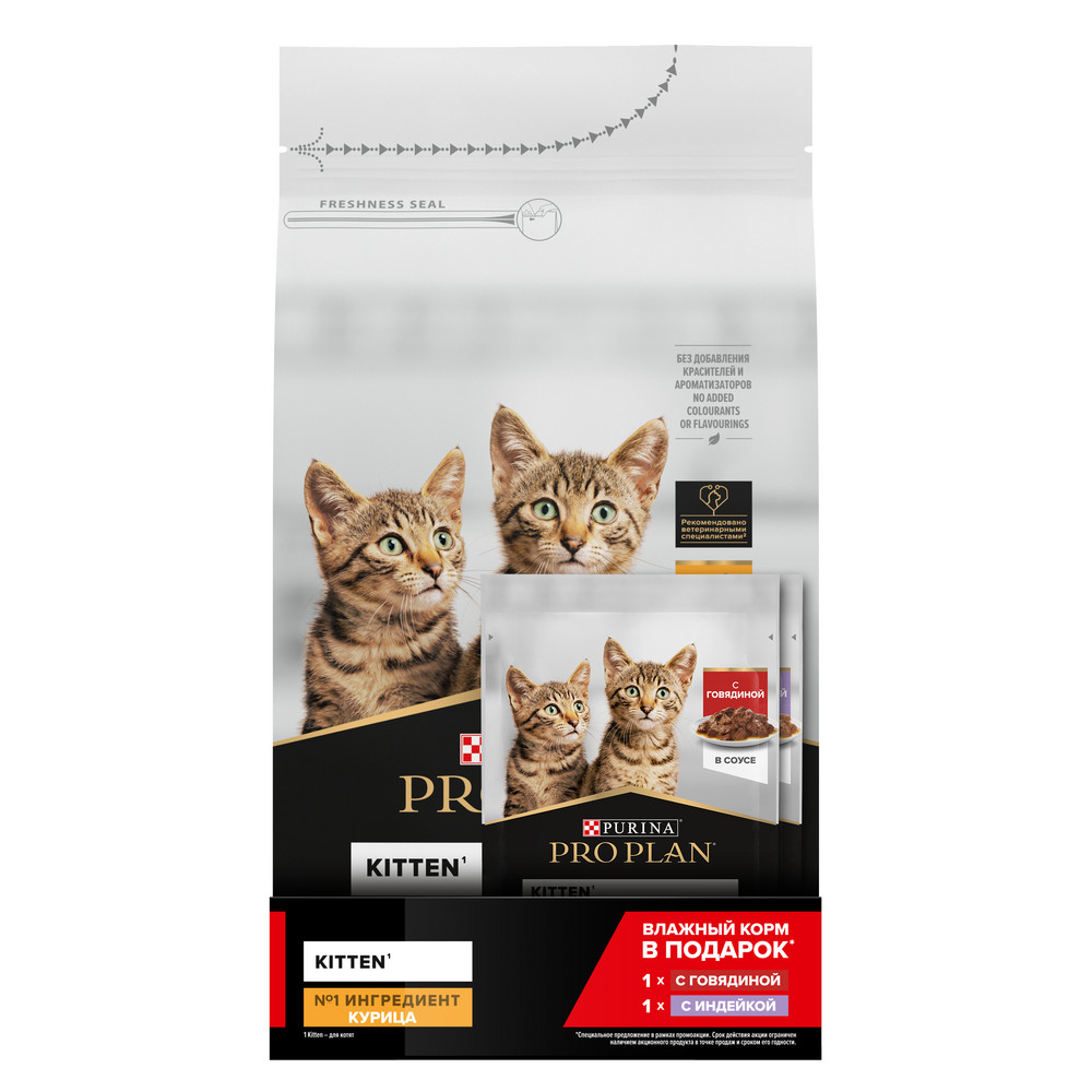 1.Сухой корм PRO PLAN® HEALTHY START для котят, с высоким содержанием курицы: 1.5 кг:белок: 40%, содержание жира: 20%, сырая зола: 7,5%, сырая клетчатка: 1%, докозагексаеновая кислота: 0,05%.
