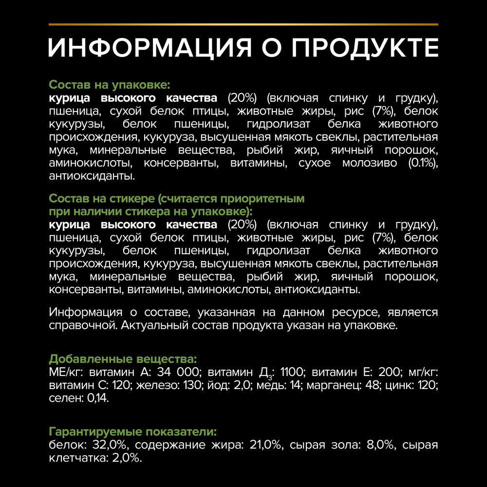 Состав на стикере (считается приоритетным при наличии стикера на упаковке): курица высокого качества (20%) (включая спинку и грудку), пшеница, сухой белок птицы, животные жиры, рис (7%), белок кукурузы, белок пшеницы, гидролизат белка животного происхождения, кукуруза, высушенная мякоть свеклы, растительная мука, минеральные вещества, рыбий жир, яичный порошок, консерванты, витамины, аминокислоты, антиоксиданты.