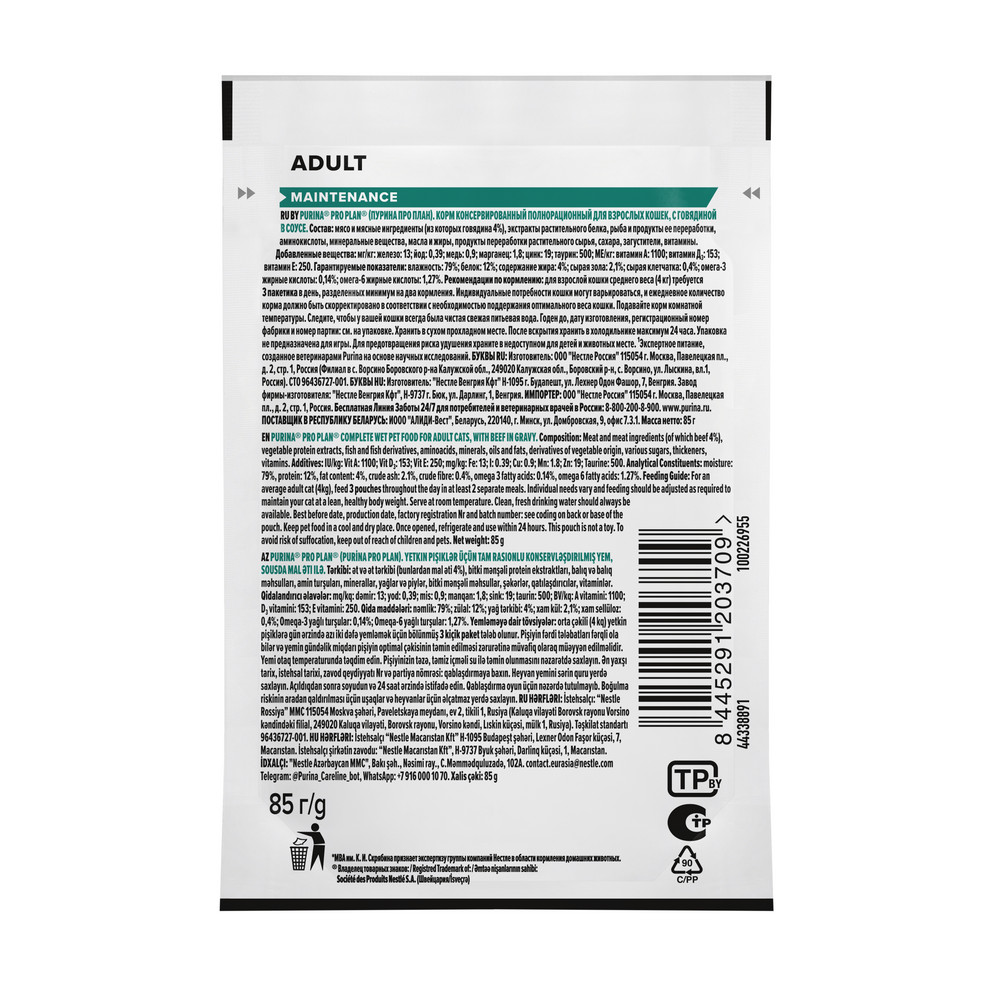 Команда квалифицированных ветеринарных специалистов разработала влажный корм для кошек PRO PLAN® MAINTENANCE с говядиной.