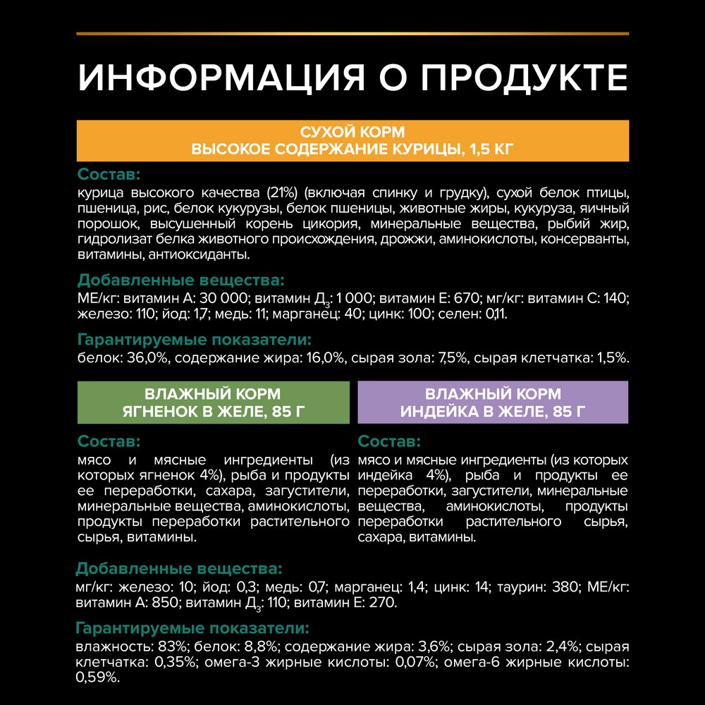 2. Влажный корм PRO PLAN® MAINTENANCE для взрослых кошек, с индейкой в желе, 85 г: мясо и мясные ингредиенты (из которых индейка 4%), рыба и продукты ее переработки, загустители, минеральные вещества, аминокислоты, продукты переработки растительного сырья, сахара, витамины.