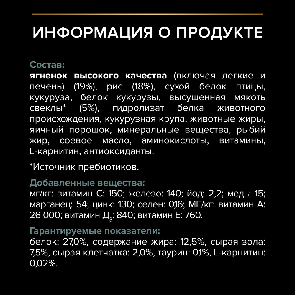 Ягненок высокого качества (включая легкие и печень) (19%), рис (18%), сухой белок птицы, кукуруза, белок кукурузы, высушенная мякоть свеклы* (5%), гидролизат белка животного происхождения, кукурузная крупа, животные жиры, яичный порошок, минеральные вещества, рыбий жир, соевое масло, аминокислоты, витамины, L-карнитин, антиоксиданты.