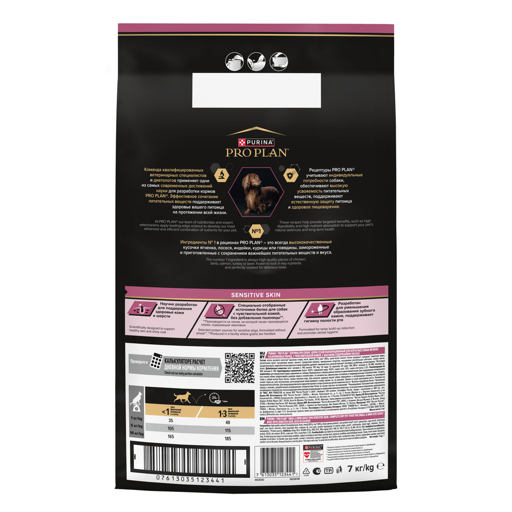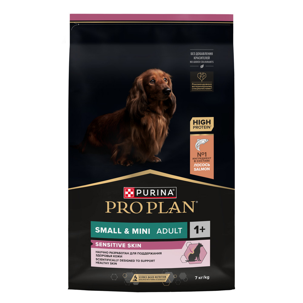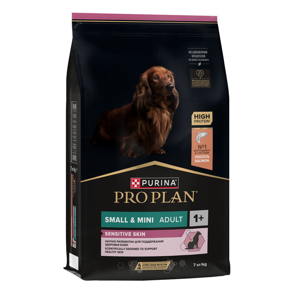 Изучая потребности собак на протяжении многих лет, команда квалифицированных ветеринарных специалистов и диетологов PURINA разработала сухой корм PRO PLAN® Sensitive skin (для чувствительной кожи) — ежедневный рацион с высоким содержанием лосося для взрослых собак мелких и карликовых пород.