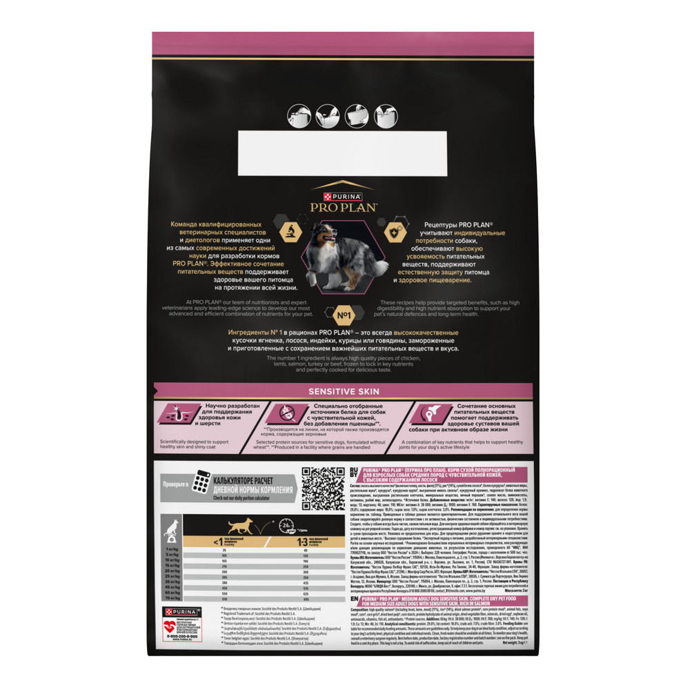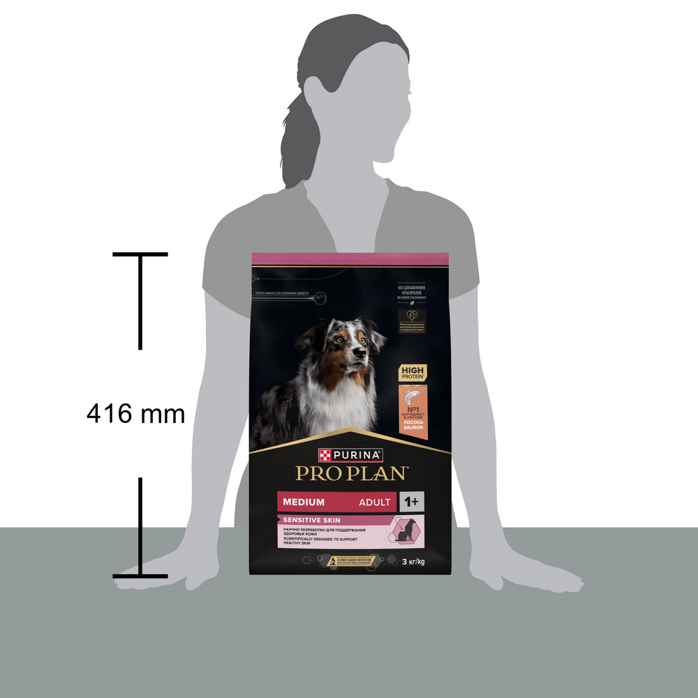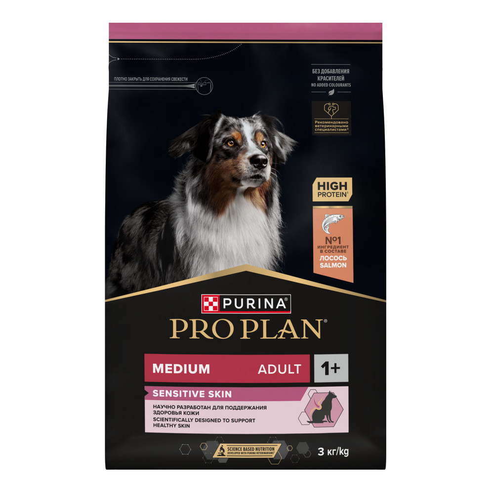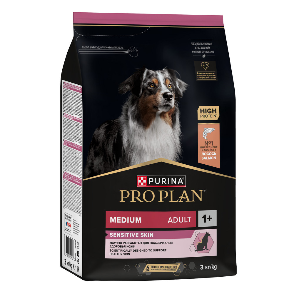 Изучая потребности собак на протяжении многих лет, команда квалифицированных ветеринарных специалистов и диетологов PURINA разработала сухой корм PRO PLAN® Sensitive skin (для чувствительной кожи) — ежедневный рацион с высоким содержанием лосося для взрослых собак средних пород.