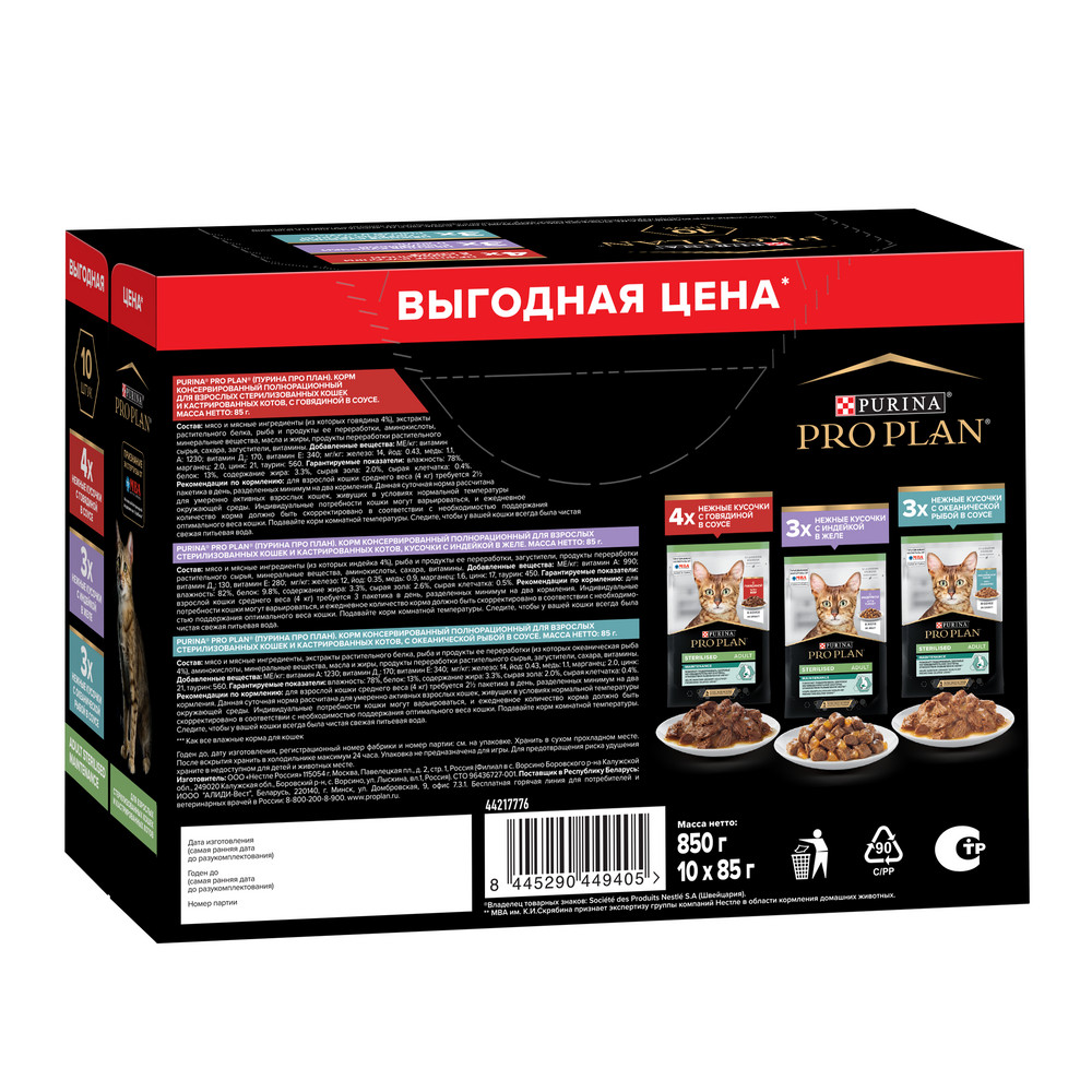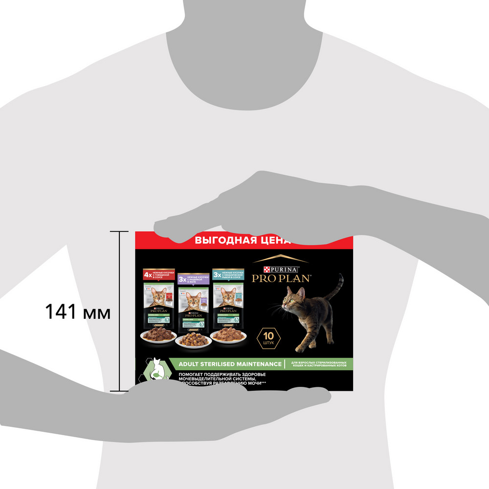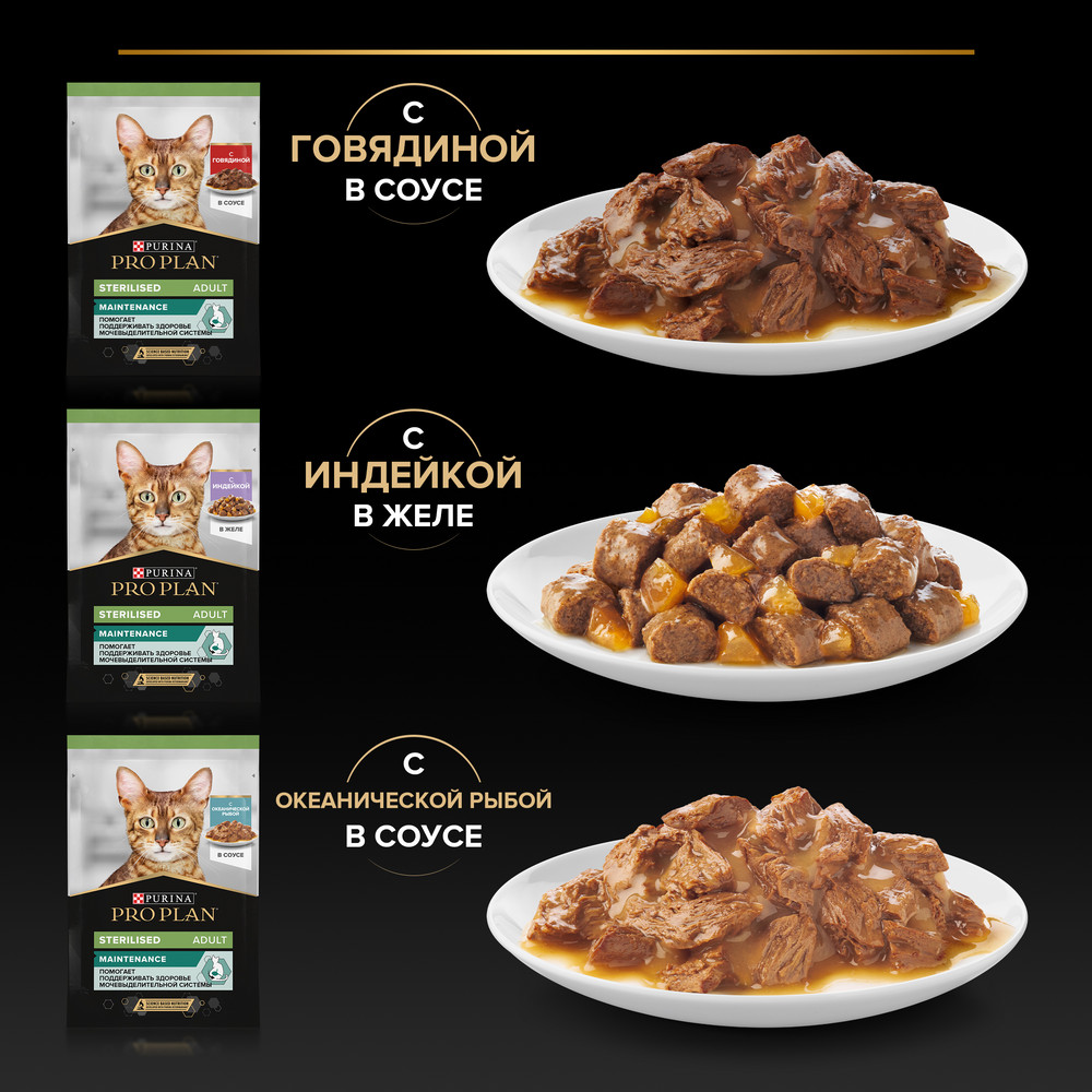 1. Влажный корм PRO PLAN® Adult STERILISED MAINTENANCE для взрослых стерилизованных кошек и кастрированных котов, с говядиной в соусе 85 г Рекомендации по кормлению: для взрослой кошки среднего веса (4 кг) требуется 2½ пакетика в день, разделенных минимум на два кормления.