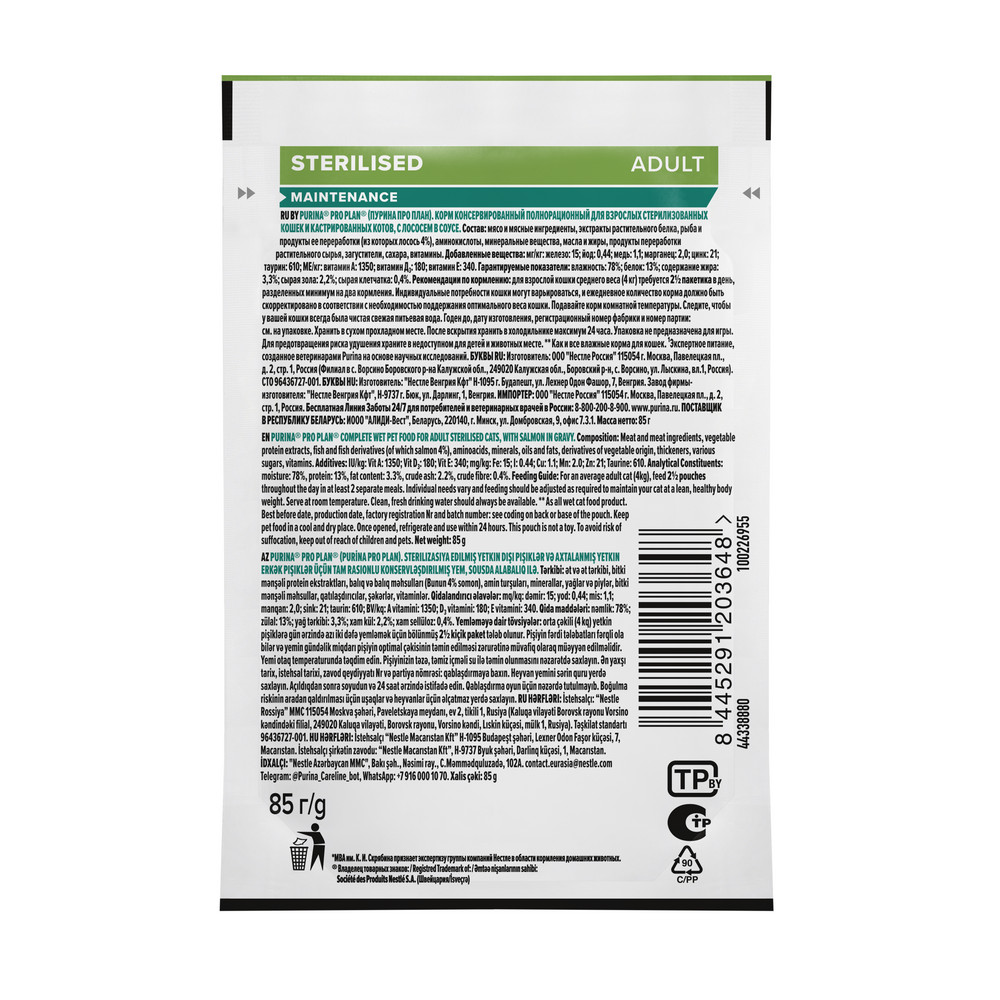 Команда квалифицированных ветеринарных специалистов разработала влажный корм для стерилизованных кошек PRO PLAN® Sterilised MAINTENANCE с лососем.