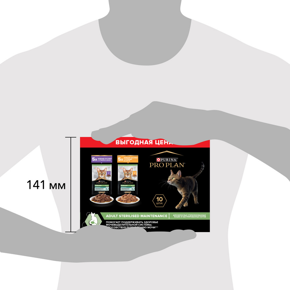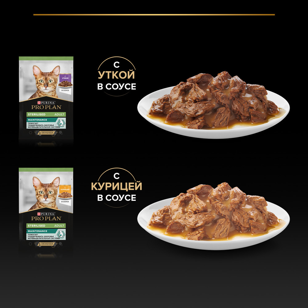 1. Влажный корм PRO PLAN® Adult STERILISED MAINTENANCE для взрослых стерилизованных кошек и кастрированных котов, с уткой в соусе 85 г Рекомендации по кормлению: для взрослой кошки среднего веса (4 кг) требуется 2½ пакетика в день, разделенных минимум на два кормления.