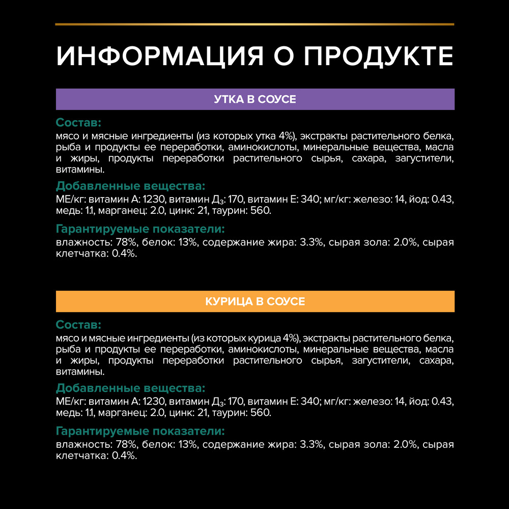 1. Влажный корм PRO PLAN® Adult STERILISED MAINTENANCE для взрослых стерилизованных кошек и кастрированных котов, с уткой в соусе, 85 г Гарантируемые показатели: влажность: 78%; белок: 13%; содержание жира: 3,3%; сырая зола: 2,0%; сырая клетчатка: 0,4%.