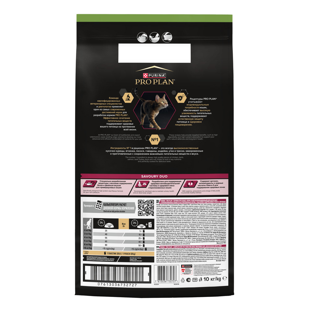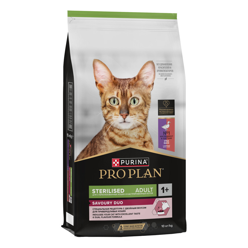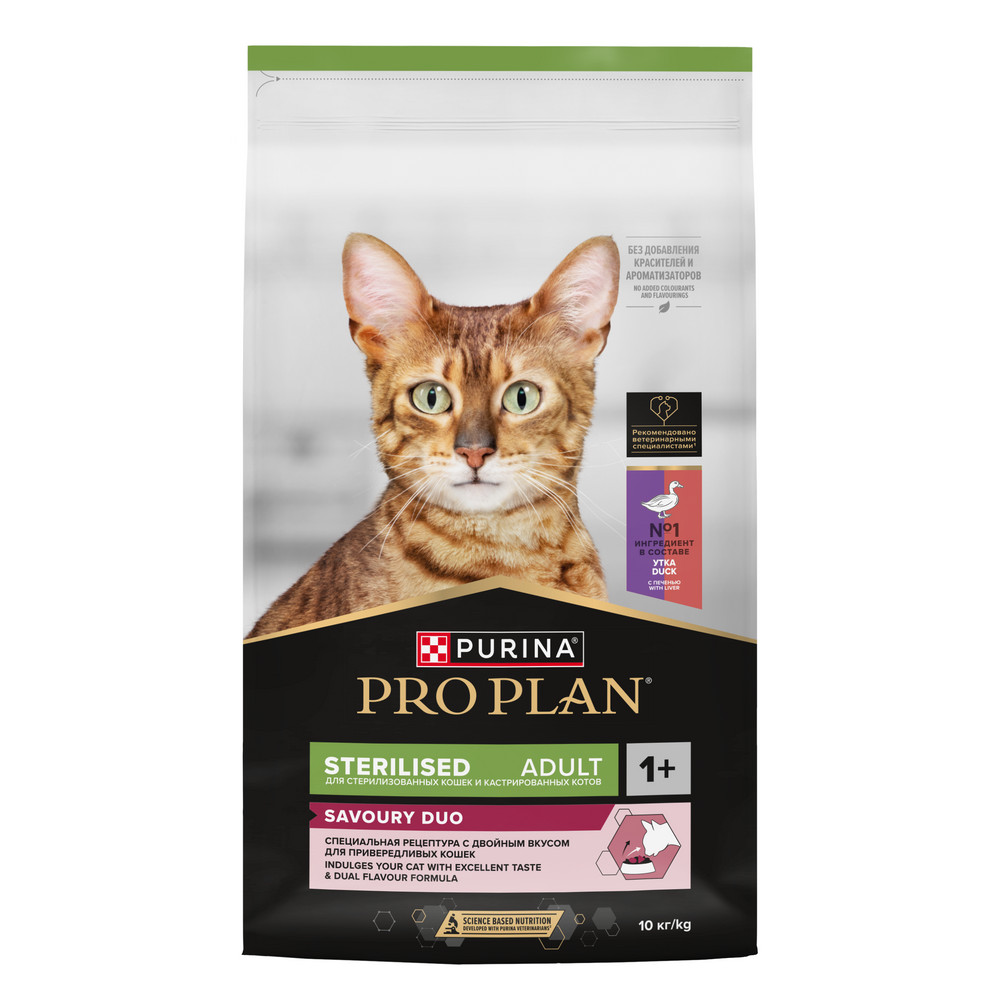 Команда квалифицированных ветеринарных специалистов и диетологов разработала сухой корм для стерилизованных привередливых кошек PRO PLAN® Sterilised SAVOURY DUO с двойным вкусом.