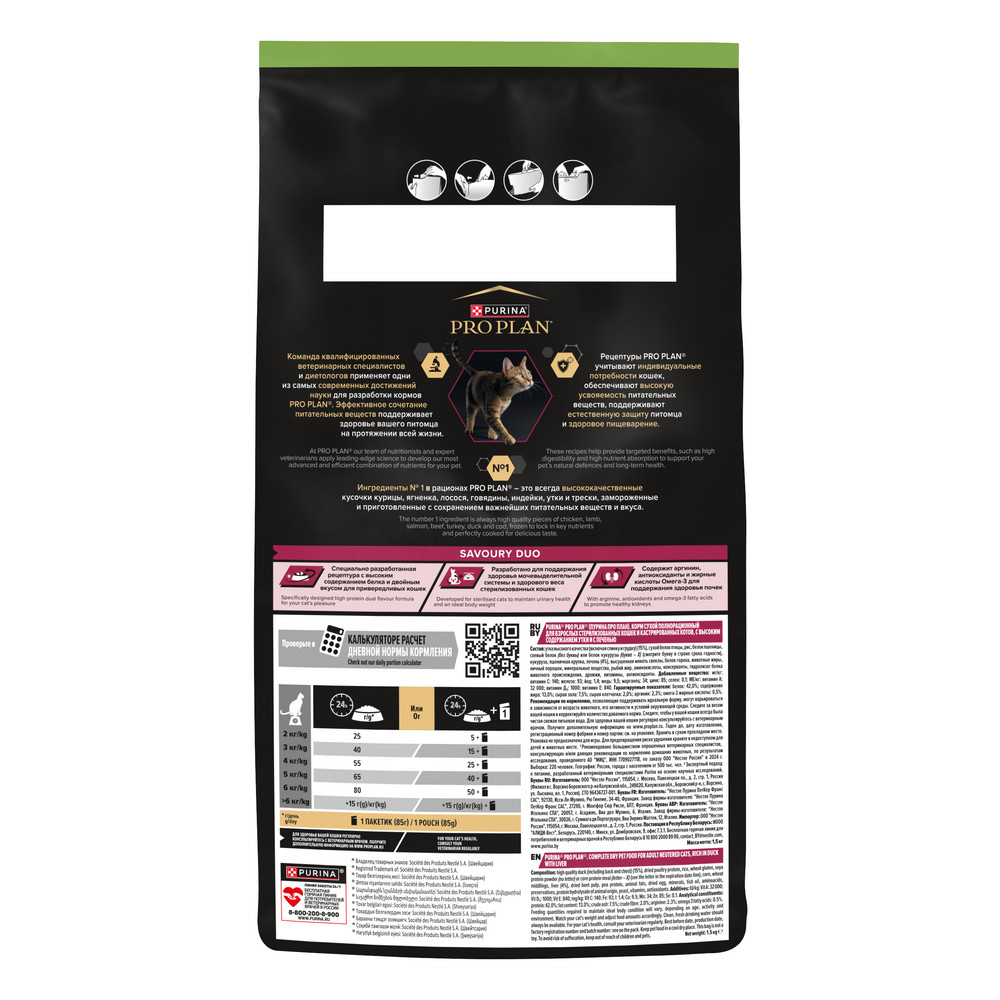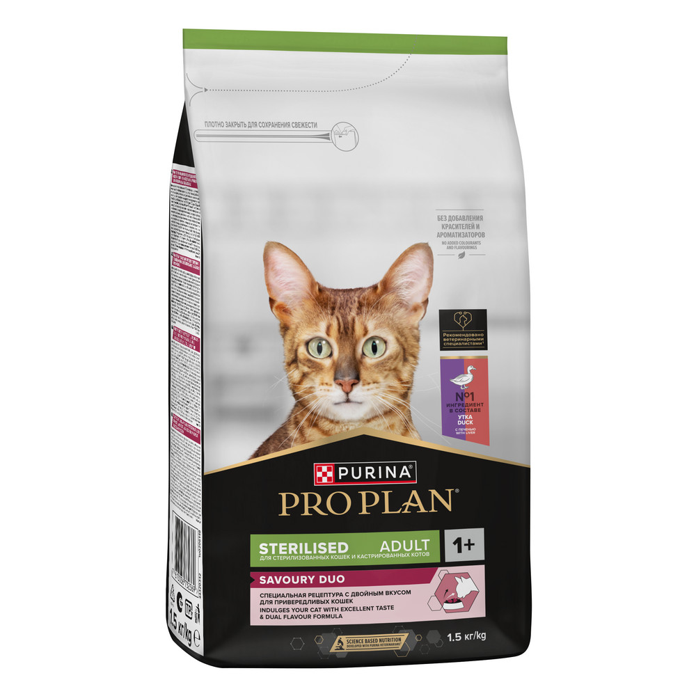 Команда квалифицированных ветеринарных специалистов и диетологов разработала сухой корм для стерилизованных привередливых кошек PRO PLAN® Sterilised SAVOURY DUO с двойным вкусом.