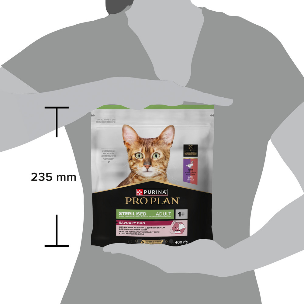 Команда квалифицированных ветеринарных специалистов и диетологов разработала сухой корм для стерилизованных привередливых кошек PRO PLAN® Sterilised SAVOURY DUO с двойным вкусом.