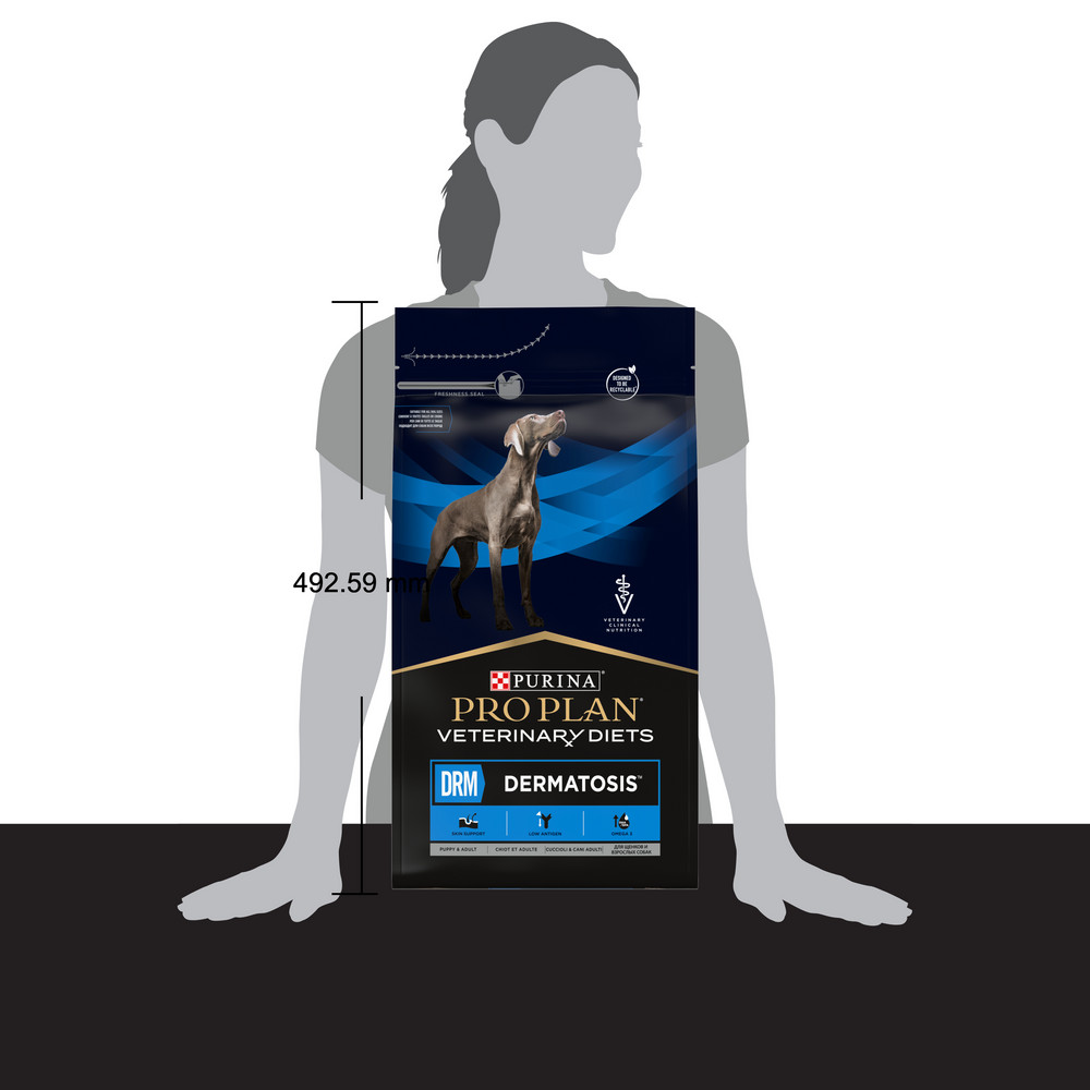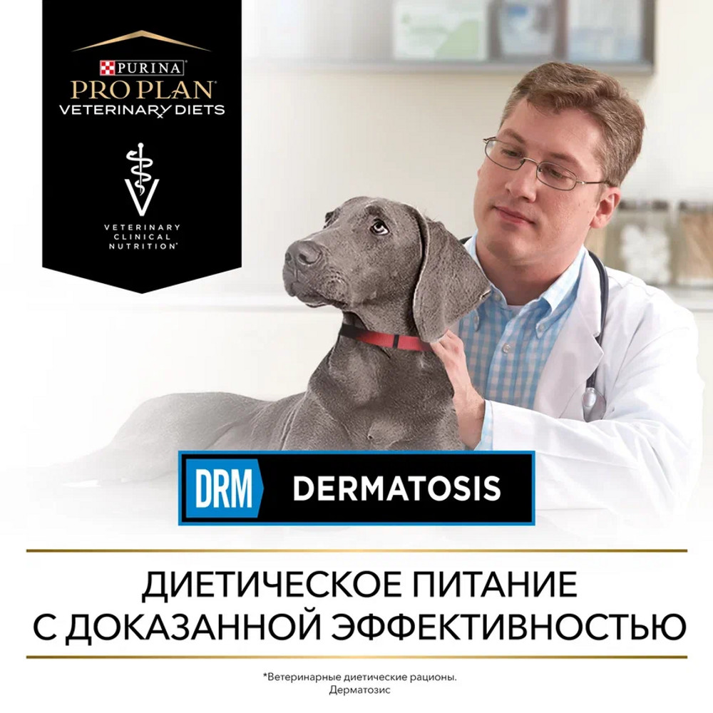 Корм сухой полнорационный диетический PRO PLAN® Veterinary Diets DRM Dermatosis (Дерматозис) для щенков и взрослых собак для поддержания здоровья кожи при дерматозах и выпадении шерсти, с высоким содержанием линолевой кислоты и суммы эйкозапентаеновой кислоты и докозагексановой кислоты.