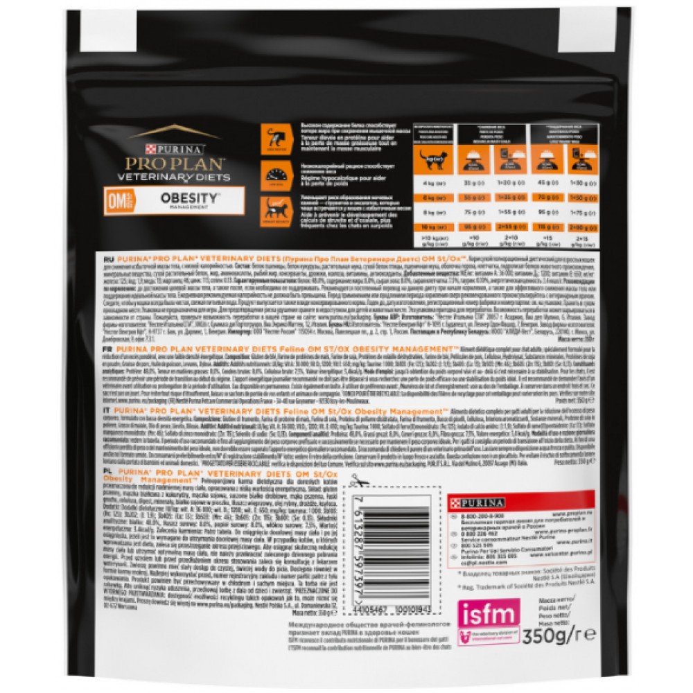 Корм сухой полнорационный диетический PRO PLAN® Veterinary Diets OM St/Ox Obesity Management (Обесити менеджмент) для взрослых кошек для снижения избыточной массы тела, с низкой калорийностью.