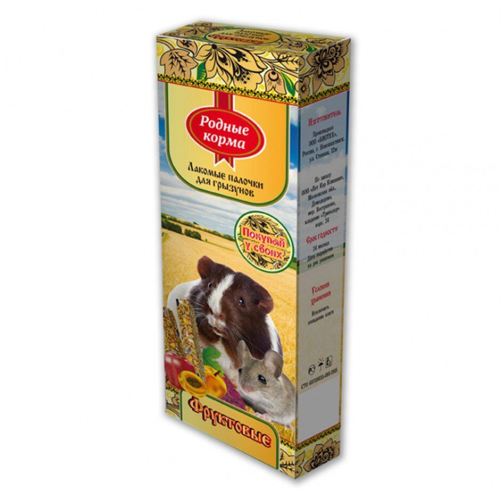 Лакомые палочки «Родные корма» с витаминами и минералами для всех видов грызунов являются отличным и вкусным дополнением к ежедневному корму Вашего питомца.