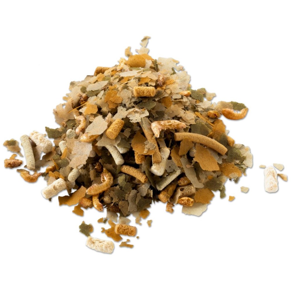 Смесь содержит хлопья, гранулы, гаммарус, таблетки, палочки.