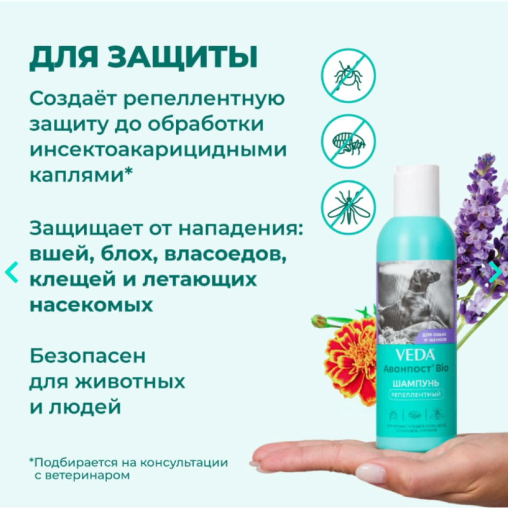 Рекомендации: для максимальной защиты от кровососущих насекомых шампунь желательно использовать в комплексе с ошейником репеллентным «АВАНПОСТ® Bio», обработать места обитания животного (лежаки и прочее).