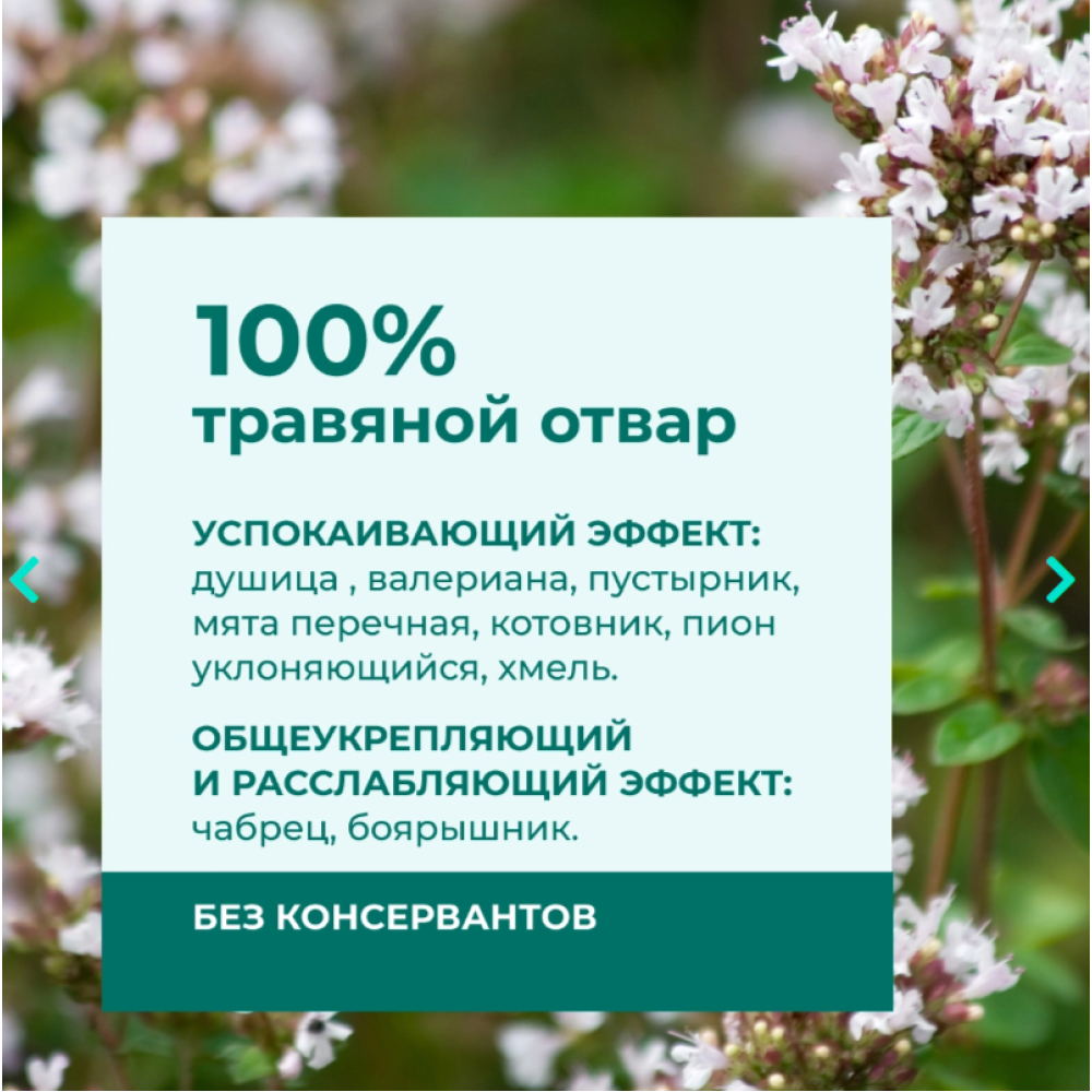 плодов боярышника, шишек хмеля, травы пустырника, листьев мяты перечной, травы котовника, травы чабреца, корней пиона уклоняющегося;