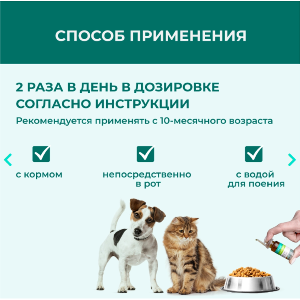 в остальных случаях кошкам и собакам по 0,5 - 1 мл на 1 кг массы тела животного, распределив на 2 приема в день, до достижения необходимого положительного результата.