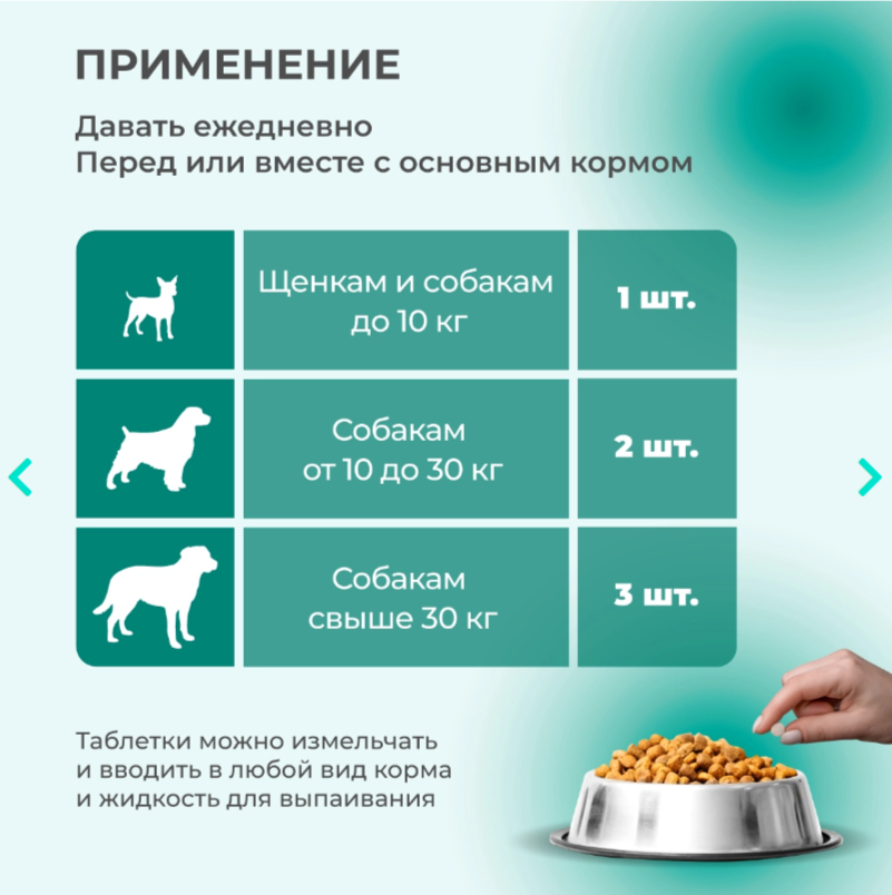 собакам крупных размеров (свыше 30 кг) по 1,5 г (3 шт.).