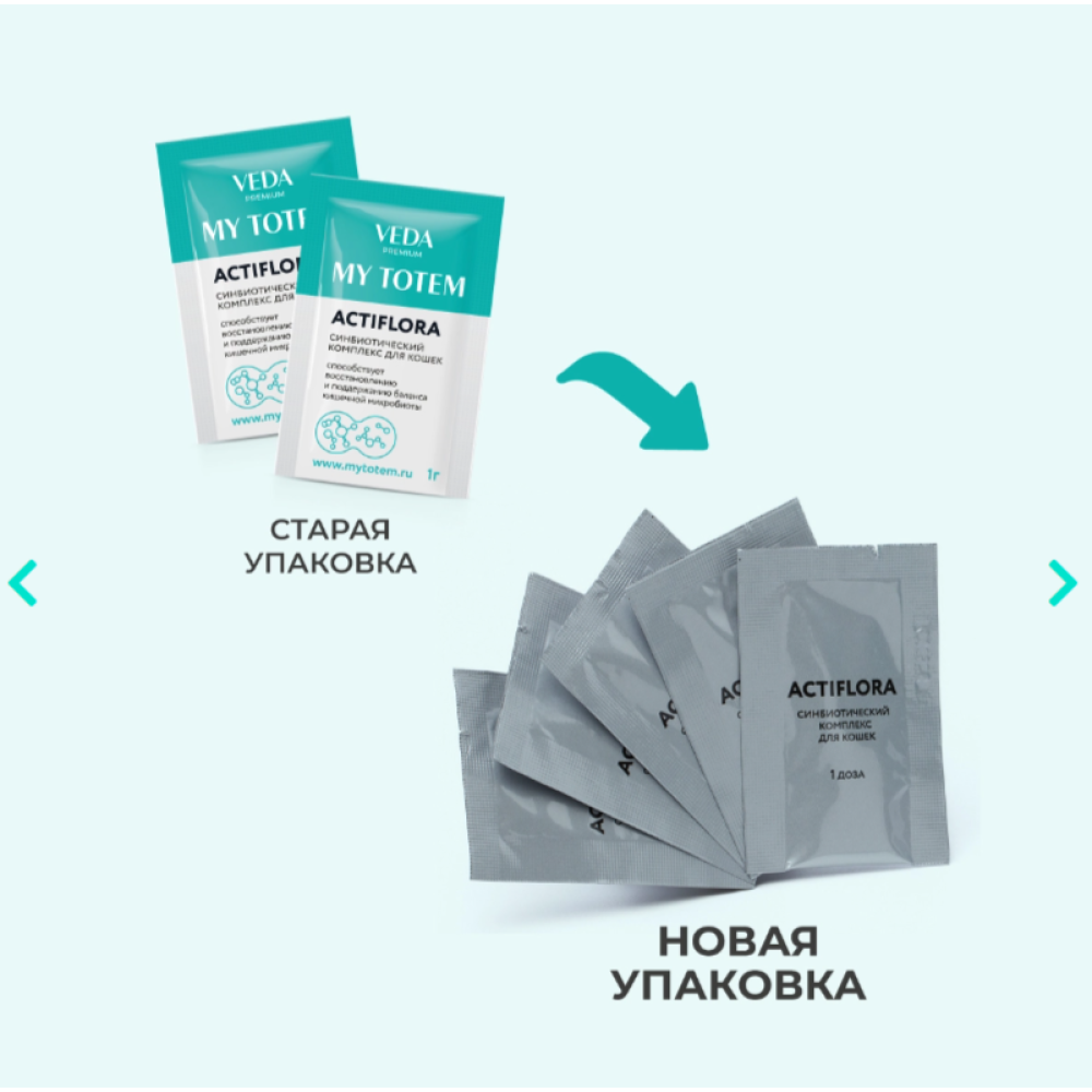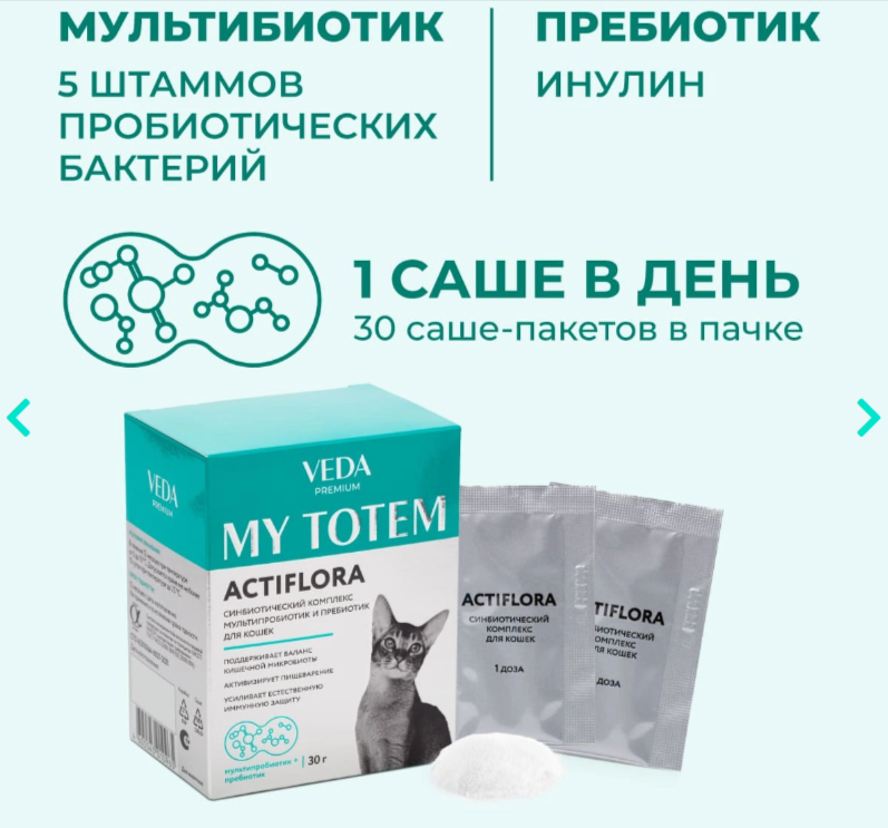 MY TOTEM ACTIFLORA синбиотический комплекс для кошек, предназначенный для введения полезной микрофлоры в составе кормовых рационов животных с раннего (3-х месячного) возраста.