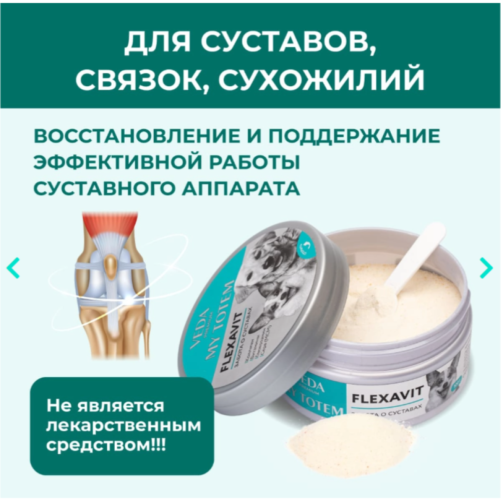 MY TOTEM FLEXAVIT для суставов для собак предназначен для систематического приема в составе кормовых рационов, обеспечивает поступление в организм животного «строительных» веществ, необходимых для нормальной работы суставов, связок, укрепления ушных хрящей.