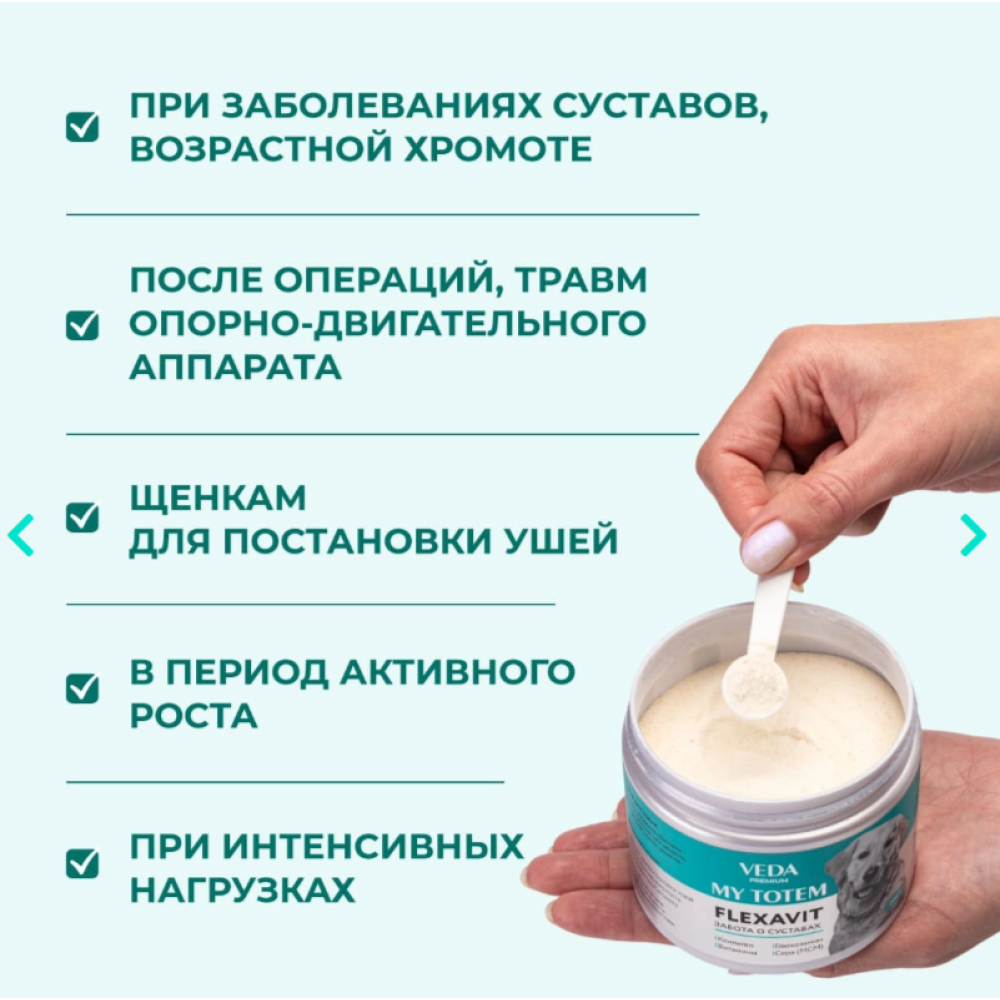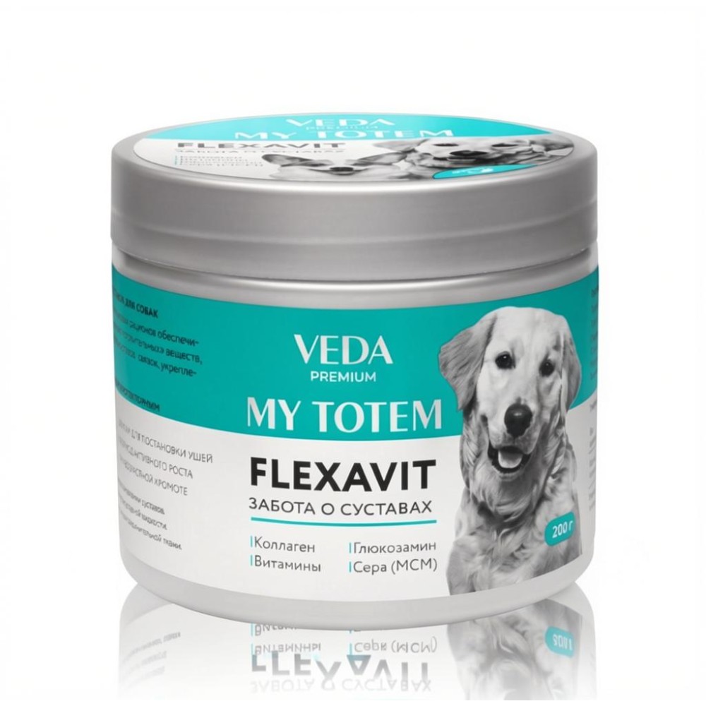 MY TOTEM FLEXAVIT для суставов для собак предназначен для систематического приема в составе кормовых рационов, обеспечивает поступление в организм животного «строительных» веществ, необходимых для нормальной работы суставов, связок, укрепления ушных хрящей.