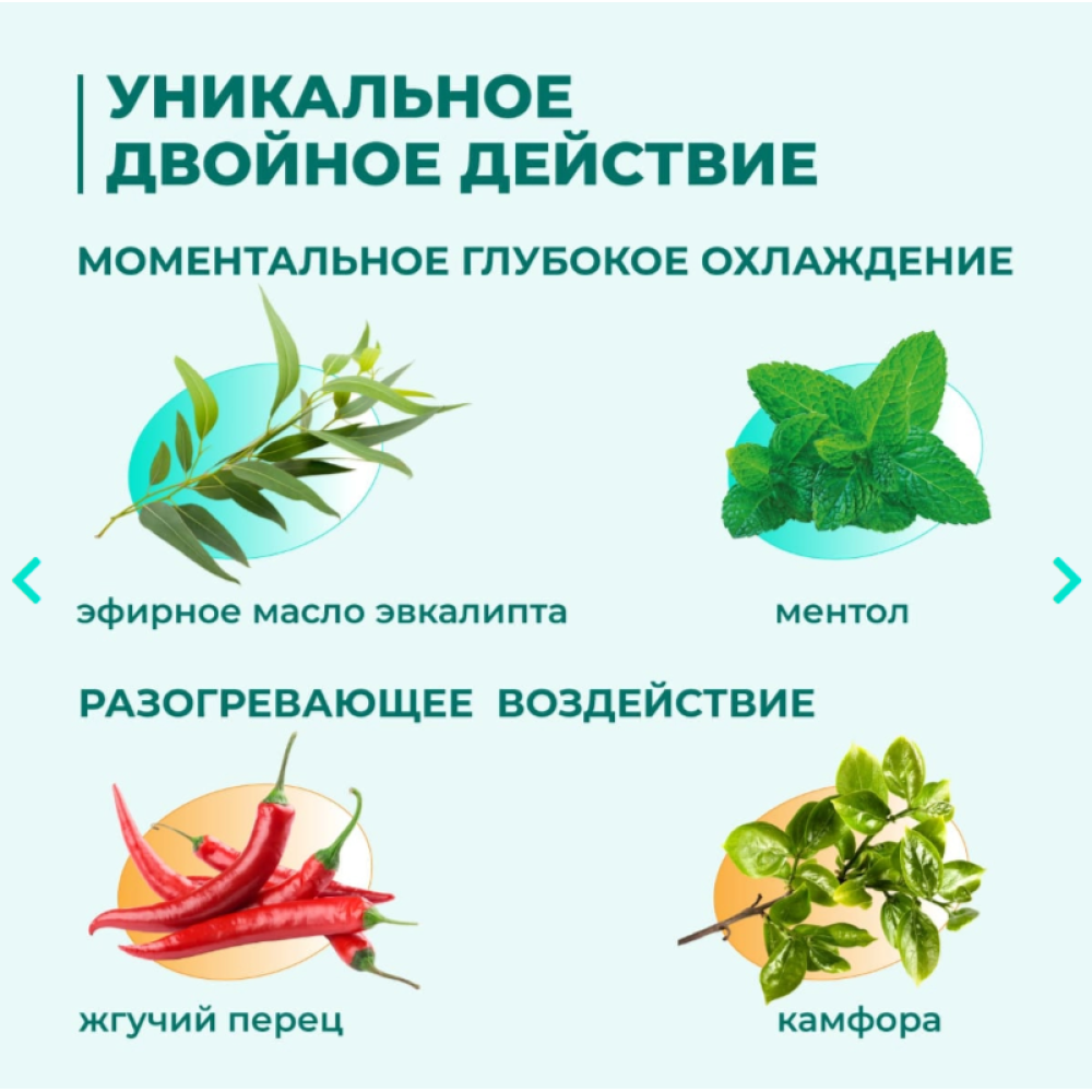 Моментальное глубокое охлаждение за счет воздействия эфирного масла эвкалипта и ментола оказывает успокаивающее действие, снимает отёчность.