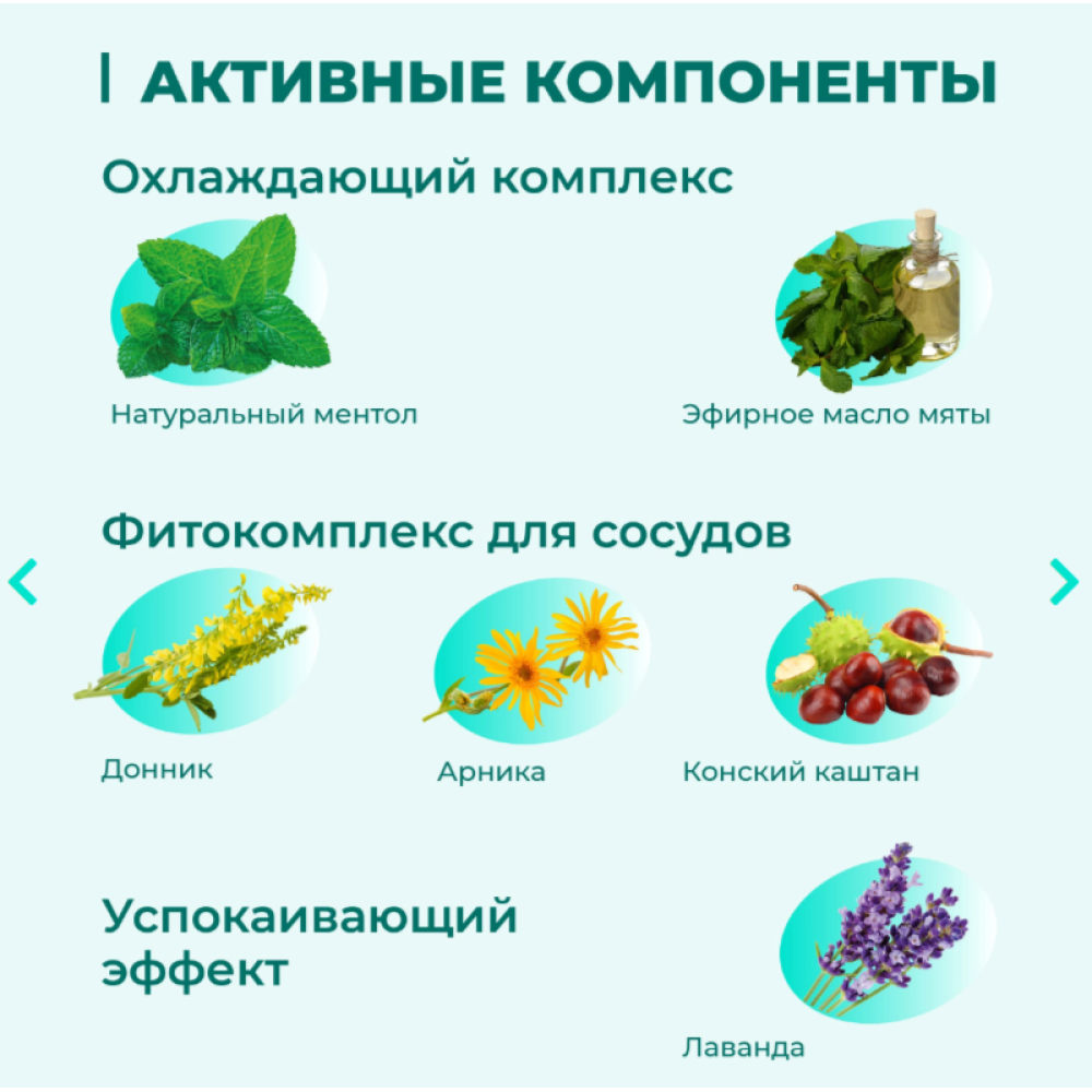 Охлаждающий комплекс действует немедленно после нанесения, снижая температуру кожи и снимая ощущение тяжести и усталости в ногах.