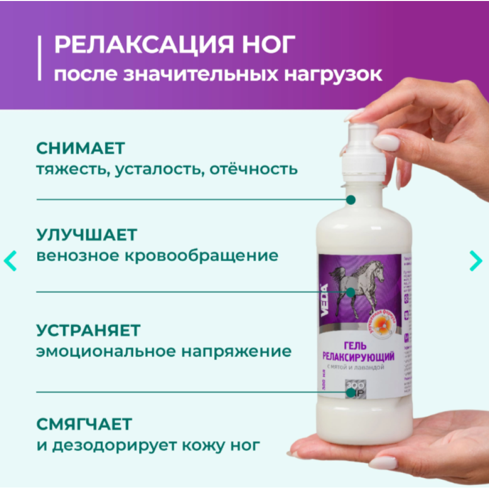 Снимает ощущение тяжести и усталости в ногах после интенсивных физических нагрузок, при спазмах мышц.
