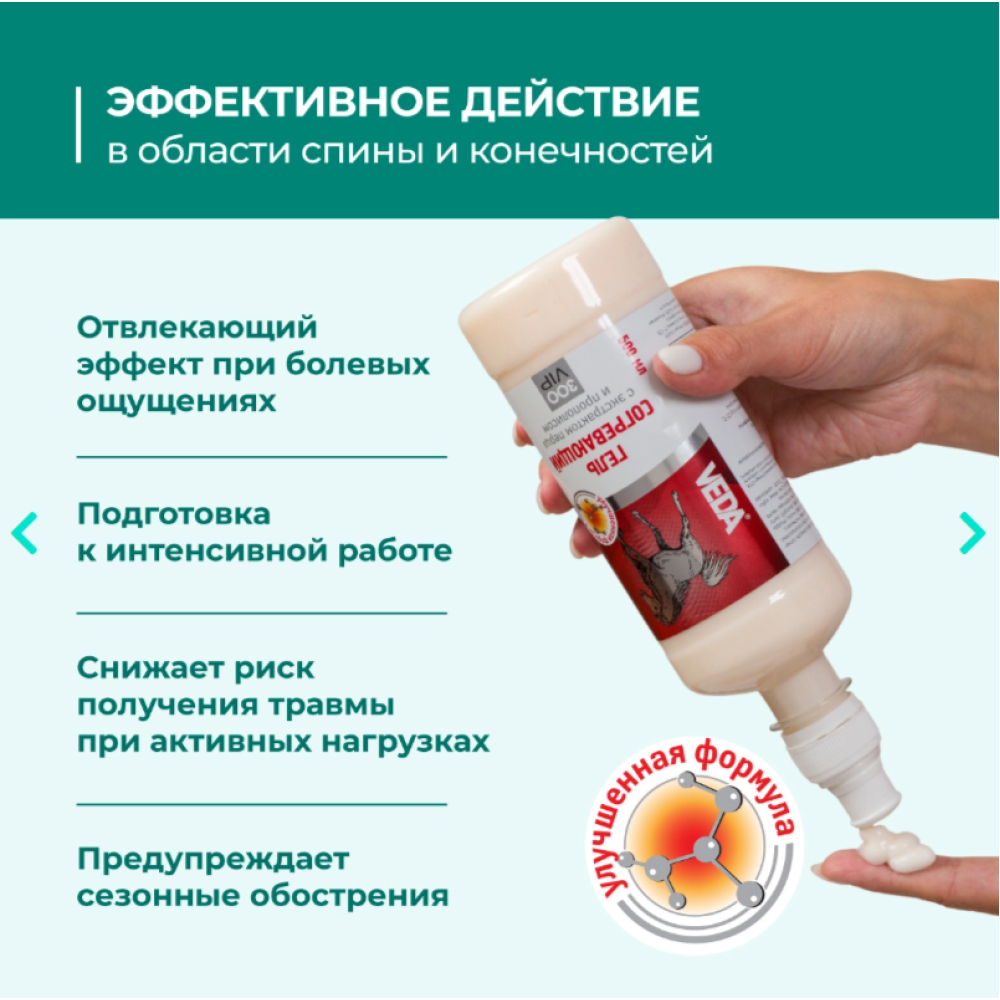Эффективно применяется: для ухода за тканями в области спины и конечностей при сезонных обострениях или избыточных нагрузках;