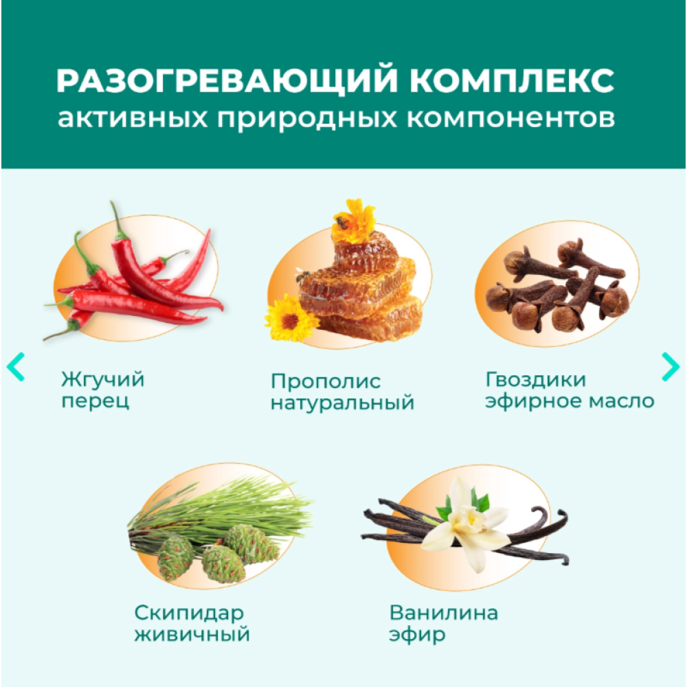 Разогревающий комплекс природных компонентов (прополис, красный перец, живичный скипидар, эфирные масла) при местном применении на проблемном участке кожи стимулирует периферическое кровообращение, ускоряет обменные процессы, оказывает отвлекающий эффект.